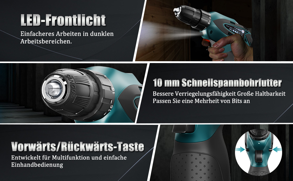 Our cordless screwdriver comes with a 10mm keyless chuck, provides an automatic spindle lock, can be replaced with one hand and has extended accessory compatibility. Forward/reverse switch to align the tool and also serves as a lock button. The built-in strong magnet can easily fix the drill. Say goodbye to tiring carpenter's work.