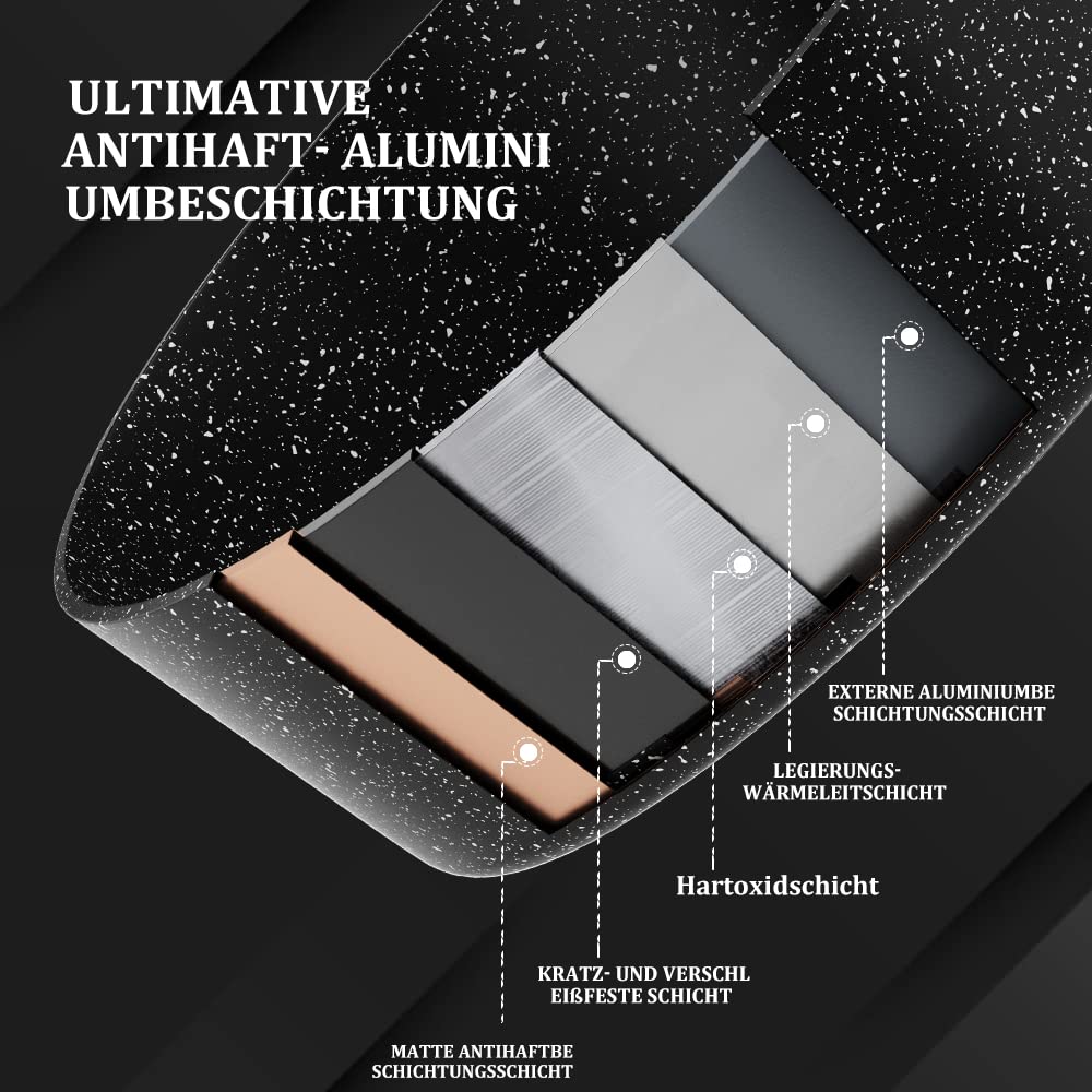 Die Bratpfanne besteht aus einer hochreinen Aluminiumlegierung mit einem Edelstahlboden mit hoher magnetischer Permeabilität, der ein schnelles und gleichmäßiges Erhitzen von Speisen gewährleistet. Und es ist für alle Herdarten geeignet, einschließlich Induktionsherde und Backöfen. Hinweis: Glasdeckel und Griff sind nicht ofenfest.