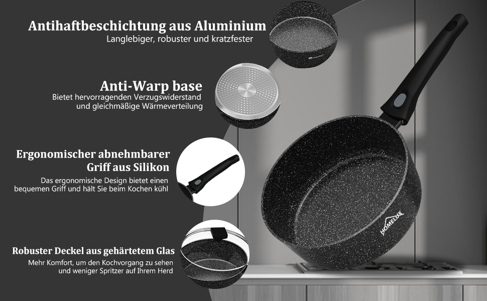 Φ 24cm,3L. Hochwertige Materialien, langlebige 5-lagige Struktur; Ausgezeichnete Antihaftbeschichtung, 6.5cm hoher rand, mit Glasabdeckung, um das Verschütten von Lebensmitteln zu verhindern; Abnehmbarer Griff, platzsparend; Geeignet für alle Herde, einschließlich Induktionsherde und Öfen. Diese Bratpfanne hat die Vorteile aller Pfannen.