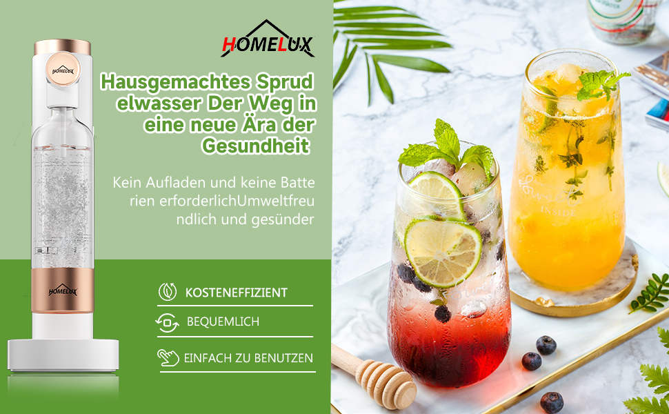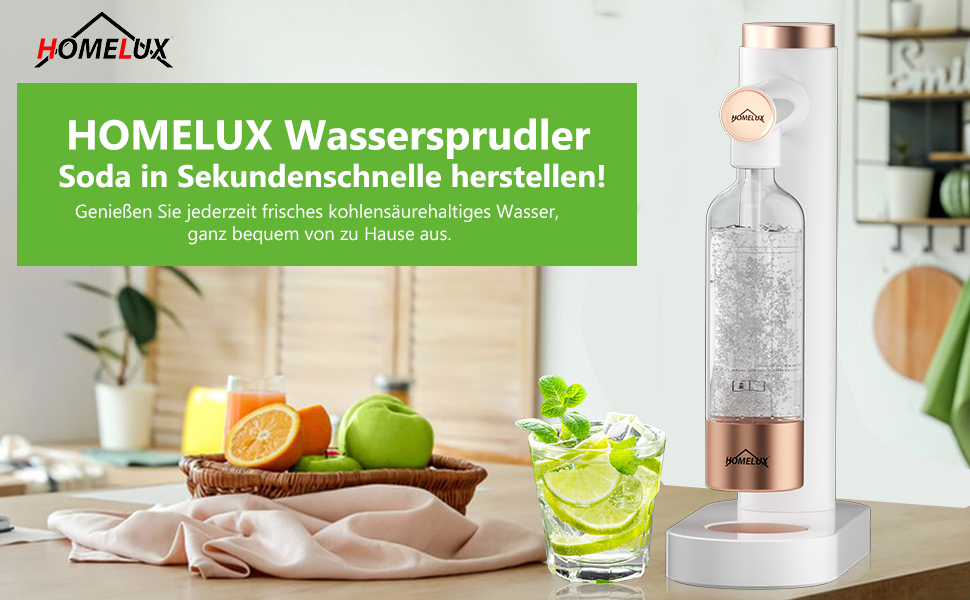 Mit HOMELUX einem Sprudler können Sie Ihre Flüssigkeitszufuhr aufrechterhalten und gleichzeitig überschüssigen Zucker und schädliche Chemikalien vermeiden. Helfen Sie außerdem der Umwelt, indem Sie zu Hause durch kohlensäurehaltige Getränke auf Einwegplastik verzichten.
