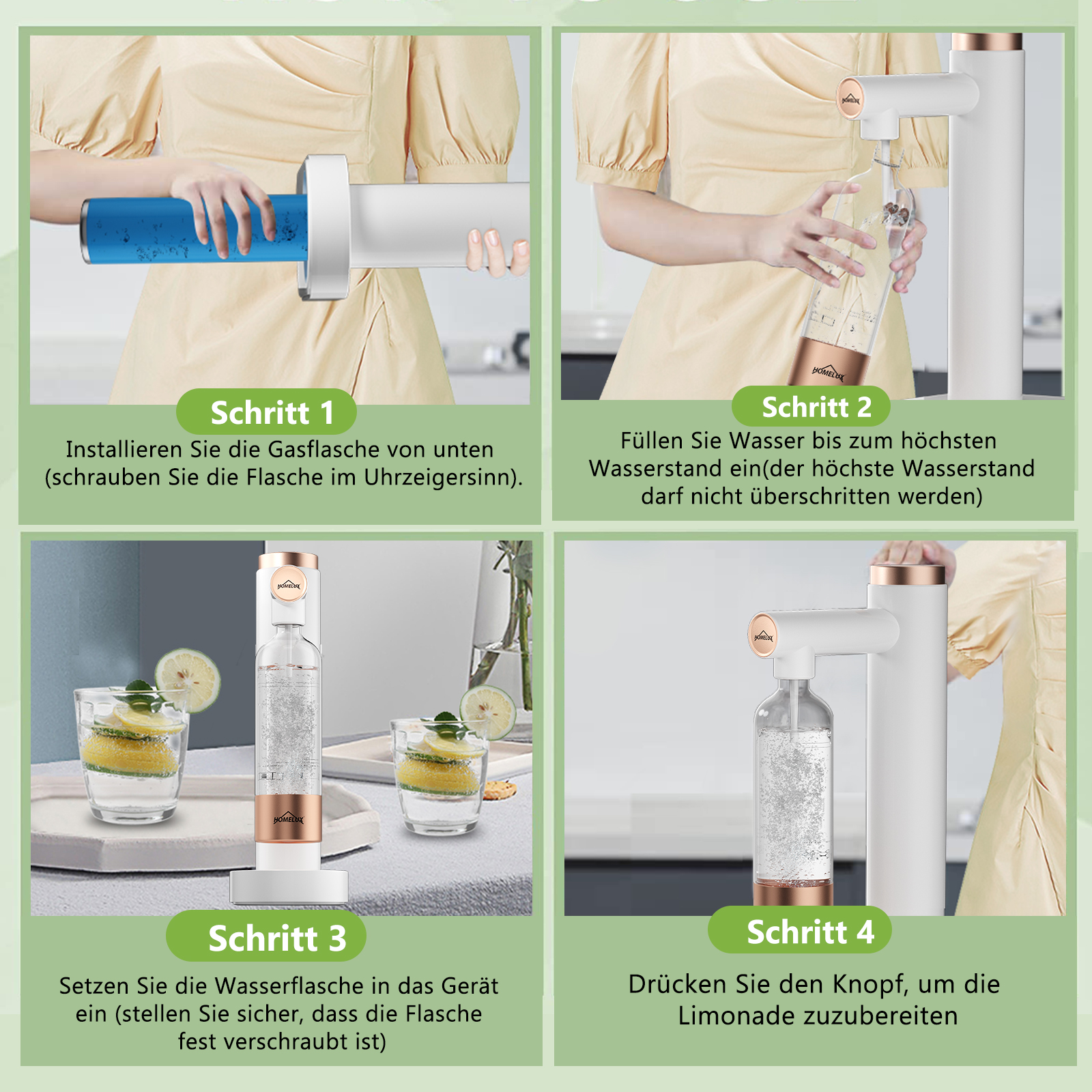 Der sparkling water machine wird mit einer 1 Liter PET-Wasserflasche in Lebensmittelqualität geliefert, BPA-frei und recycelbar, nicht nur für die Küche, sondern auch für den Esstisch geeignet. Entwickelt für Langlebigkeit und um dem Druck der Kohlensäure standzuhalten, verfügt es über einen luftdichten Deckel, damit Ihre kohlensäurehaltigen Getränke länger kohlensäurehaltig bleiben.