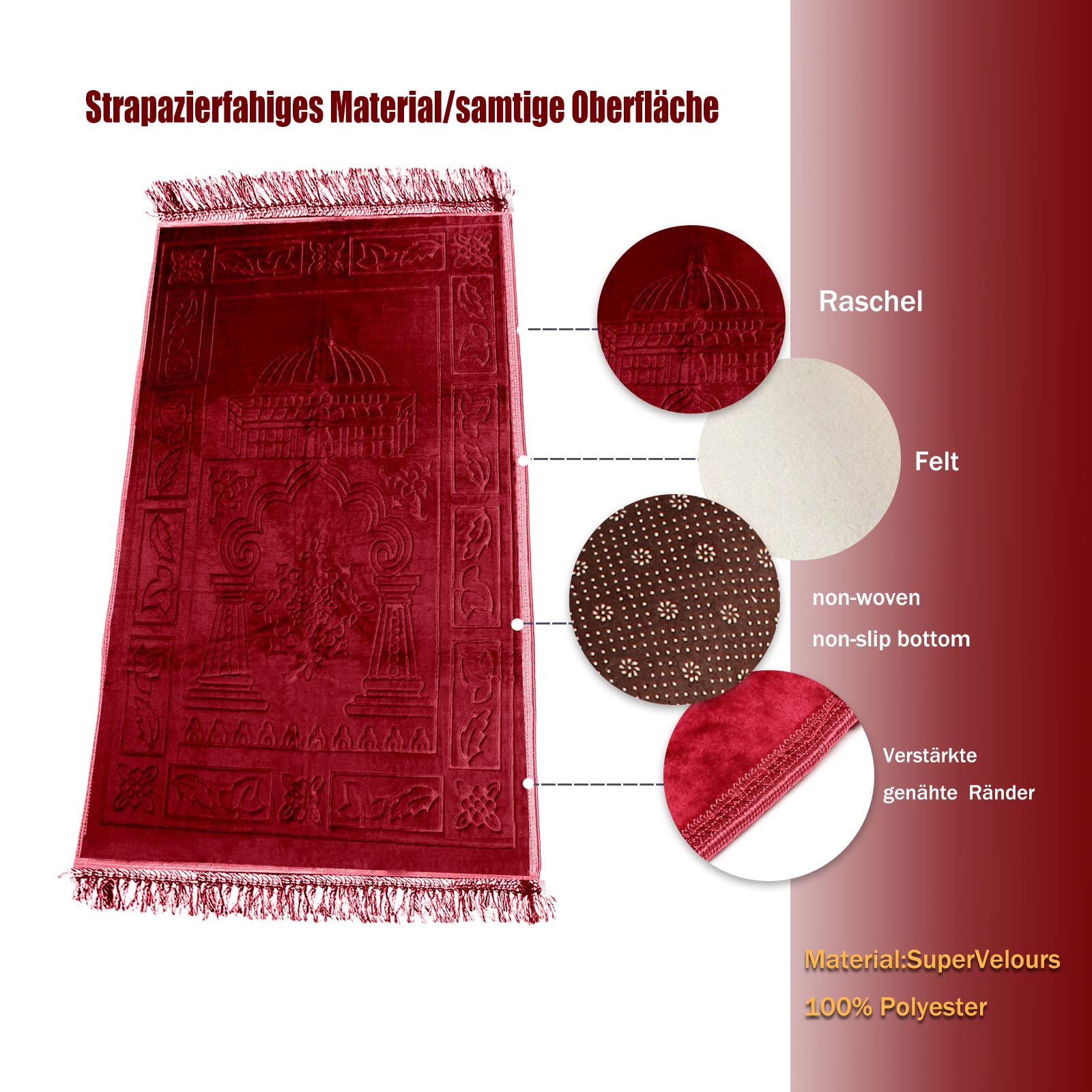 Exquisite islamische muslimisch-türkische Gebetsmatte mit den dekorativen Quasten an beiden Enden, die Unterseite besteht aus rutschfestem Material. Verstärkte genähte Ränder sorgen für Sicherheit und Haltbarkeit, Sie können es leicht zur Aufbewahrung aufrollen.