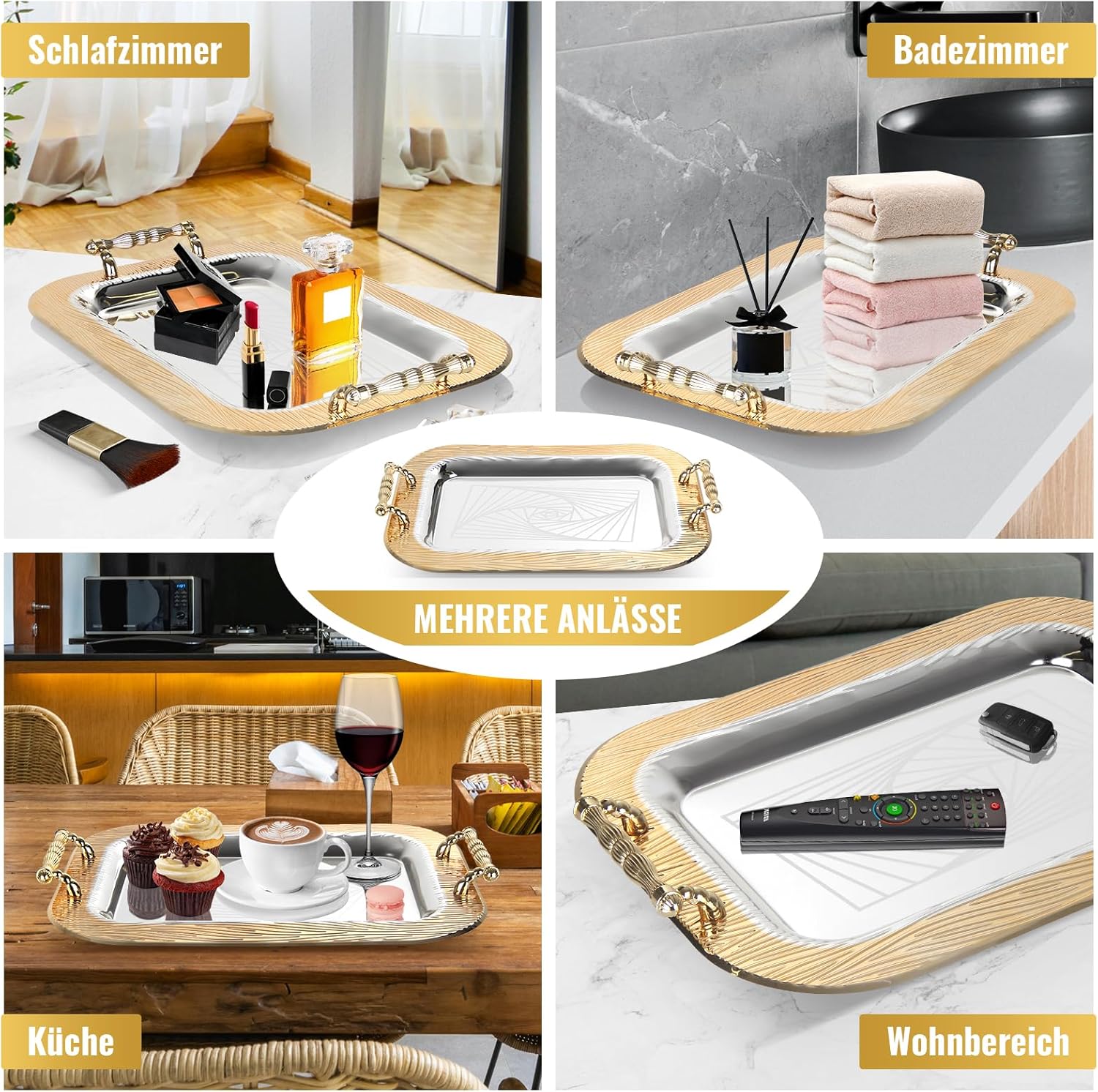 Tablett Set: Zwei Größen von Tabletts, die verschiedene tägliche Nutzungsanforderungen erfüllen können. Größe: 46x35cm & 36x26cm Tablettset. Praktisches Tablett: Dieses charmante Tablett eignet sich für den Einsatz in jeder Szene. Es kann nicht nur im Wohnzimmer, Esszimmer oder Schlafzimmer platziert werden, sondern auch als Badezimmertablett oder Serviertablett verwendet werden. Dieses schöne Tablett wird Sie definitiv nicht enttäuschen. Deko Tablett: Dieses charmante Tablett hat zeitlose Schönheit und elegante visuelle Effekte, geeignet für den Einsatz in jeder Szene. Sie können auch viele Weihnachtsdekorationsideen verwirklichen, wie zum Beispiel Weihnachtsschalendekoration, bei denen Sie Ihre Gestaltungskraft voll entfalten können. Ausgezeichnetes Material. Edelstahl-Metallmaterial ist nicht nur robust und langlebig, sondern auch leicht. Die Oberflächenbeschichtung ist fein, und die Kanten sind glatt, aber nicht scharf. Exquisite Handwerkskunst und hochglänzende Tabletts können leicht zu Highlights in der Szene werden. Homelux Dekoratives Tablett Set | Vielseitig | Hochwertige Materialien | Exquisite Verarbeitung | Kann als dekoratives Tablett & Servierplatte & Kerzenschale.