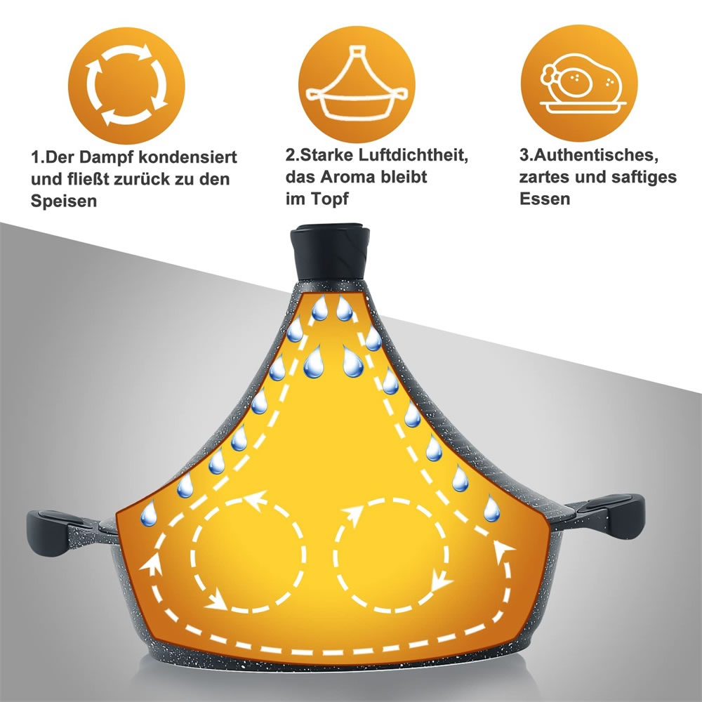 Durch seinen KEGELFÖRMIGEN Aluminiumgussdeckel hilft es, Feuchtigkeit zu speichern, die beim Kochen zirkuliert und das Essen mit starken Aromen bereichert. Somit sind mehr leckere Mahlzeiten garantiert!