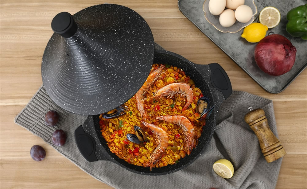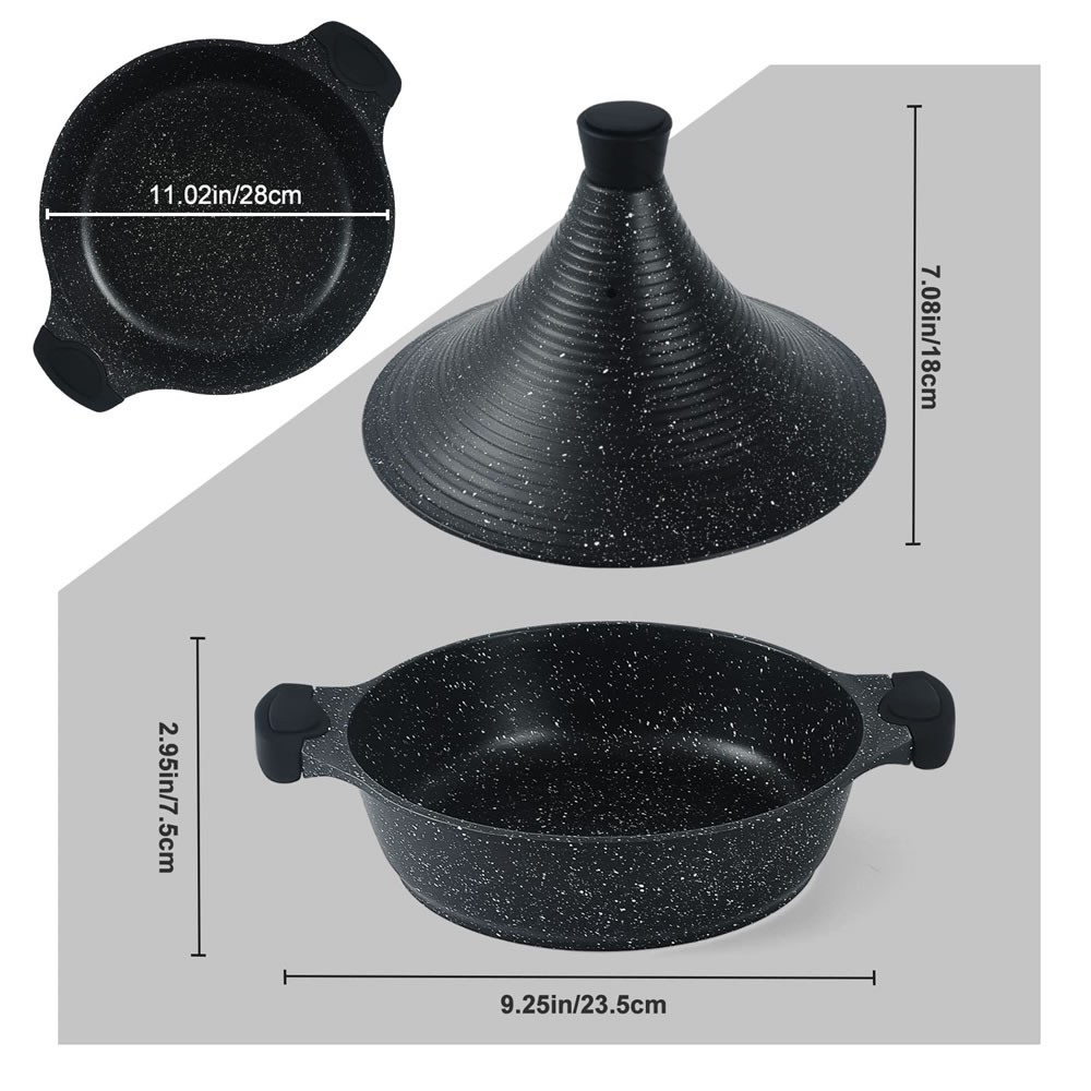 Edelstahl-Verbundboden und Aluminiumgussdeckel machen das Produkt viel leichter als Gusseisen- oder Keramik-Tajines und hält die Wärme länger.