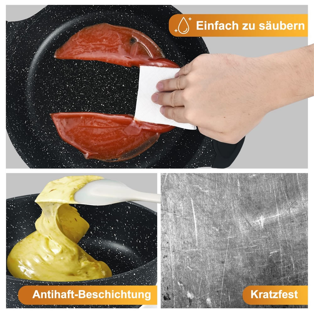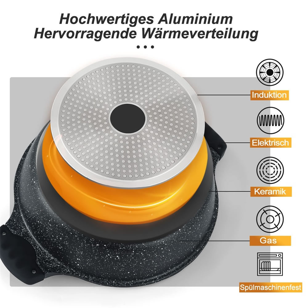 Der Deckelgriff und die Topfgriffe sind aus speziellem Material, um Verbrühungen zu vermeiden. Sie können den Topf einfach und sicher halten und den Deckel während oder nach dem Kochen öffnen ohne sich zu verbrühen. Dieses Produkt ist nicht für den Backofen geeignet.