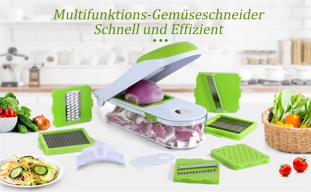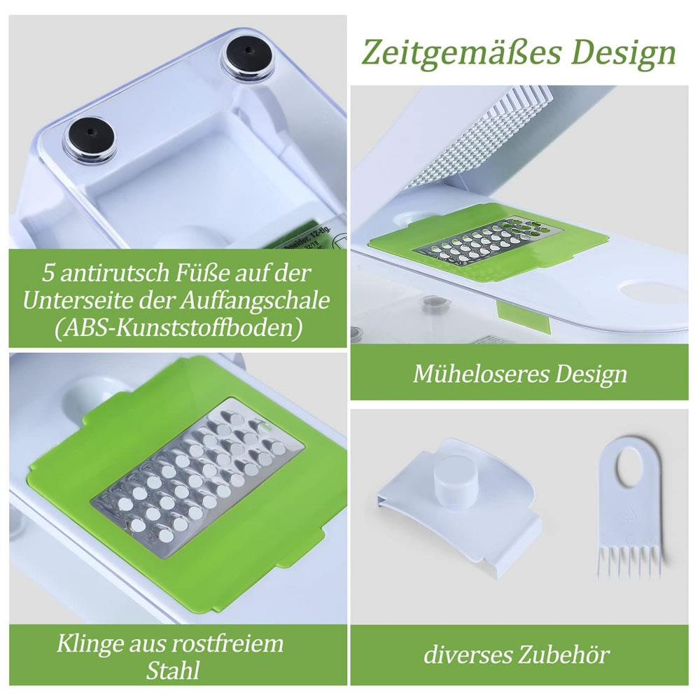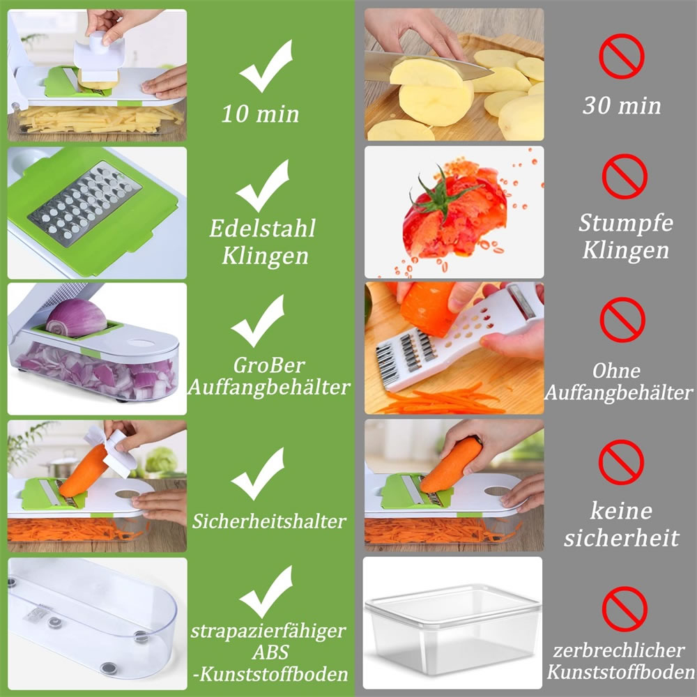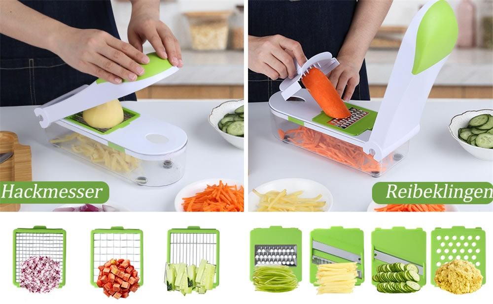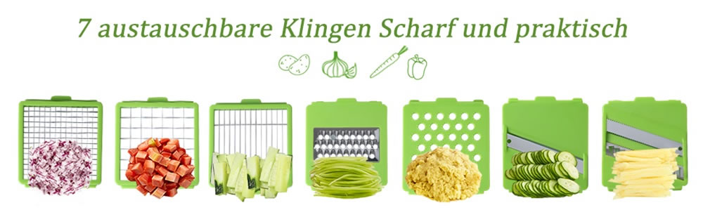 Gemüseschneider aus hochwertigen robusten Edelstahlklingen, rostfrei, frei von BPA und lebensmittelechtem ABS-Kunststoff, geruchlos, sicher und langlebig. Scheffler Multifunktions-Gemüseschneider ist einfach zu handhaben und hilft ihnen Platz zu sparen und ist dadurch ein richitger Küchenhelfer.