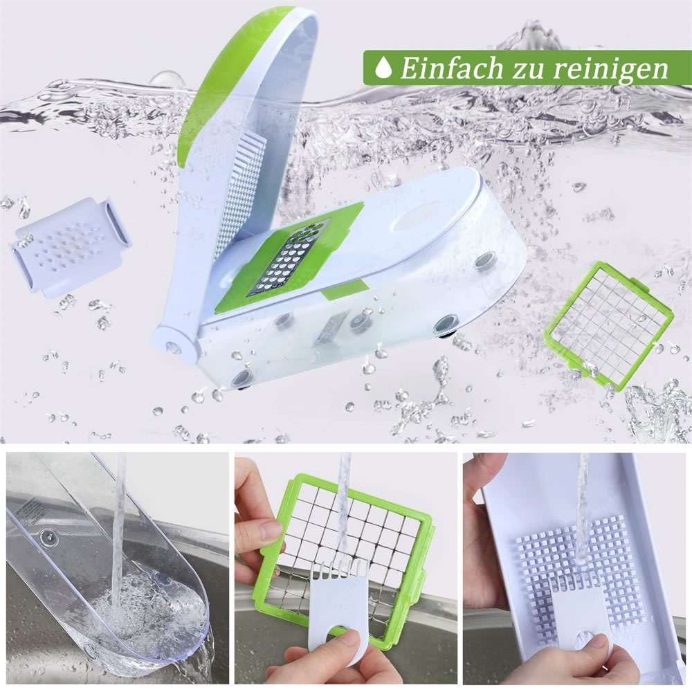 Obst und Gemüseschneider lässt sich problemlos vollständig zerlegen und wird mit der Reinigungskralle geliefert, die die einfache Reinigung ermöglicht. Die Klingen sind ultrascharf, deshalb seien Sie bitte bei der Verwendung oder Reinigung besonders vorsichtig. In dem mitgelieferten Behälter können Sie alle Teile sicher lagern. Durch die kompakte Größe ist es möglich ihn fast überall aufzubewahren.