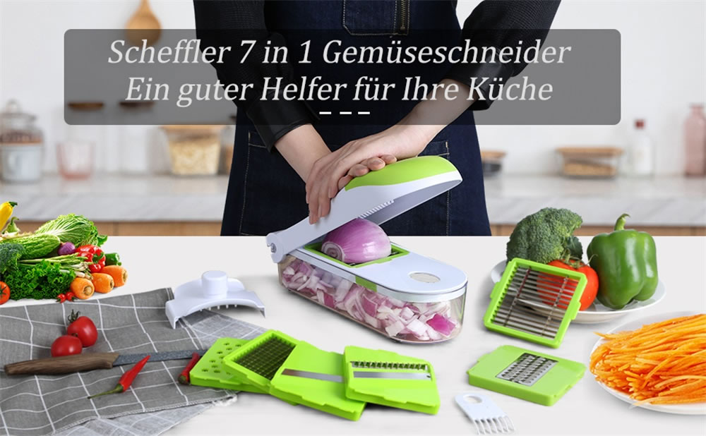 Gemüseschneider Scheffler 7 in 1 Gemüsehobel,Multifunktions-Gemüseschne,Mandoline,Zwiebelschneider,Pommesschneider,Reibe Edelstahl,Obst und Gemüseschneider,Gurkenhobel für Alle Gemüse Obst, B408C