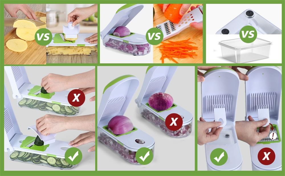 Die Rückseite des Gemüseschneider Bretts ist mit einer dicken Wabenstruktur versehen, wenn Sie den Heckdeckel drücken, können die Lebensmittel direkt in den Behälter geschnitten werden,ohne dass ein Messer und ein Schneidebrett durcheinander geraten.Der Boden des Auffangbehälters ist mit 5 Antirutschfüßen ausgestattet, um die Stabilität zu erhalten. Das Set wird mit einem Fingerschutz geliefert, der das Schnittgut sicher hält und vor Verletzungen schützt.