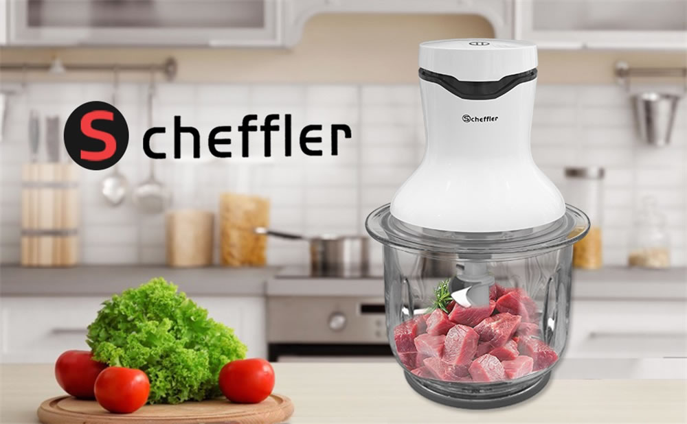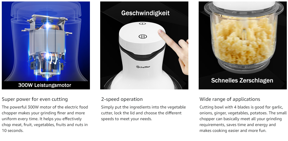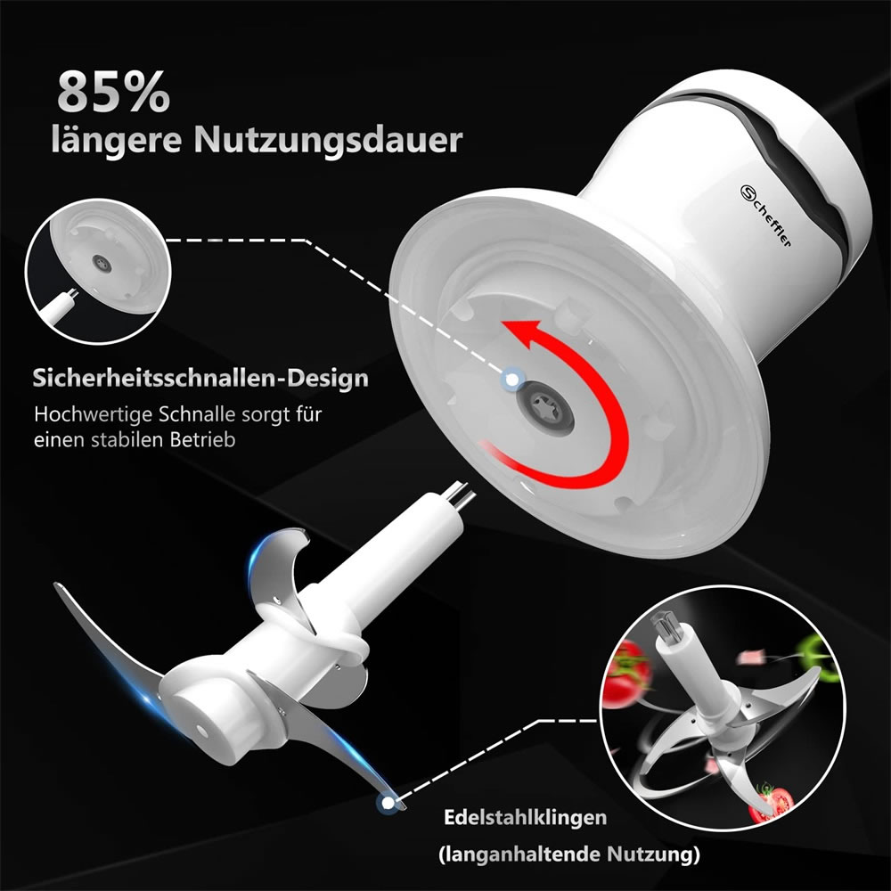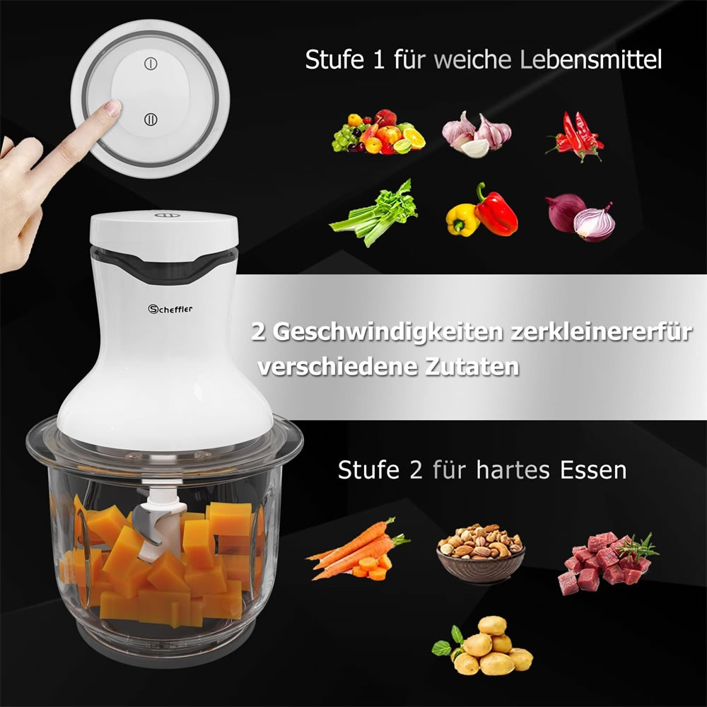 Scheffler elektrische Multizerkleinerer mit 300W starkem Motor, ist ausgestattet mit einem 1.5L Glasbehälter. BPA-frei, robust, stoßfest und langlebig.