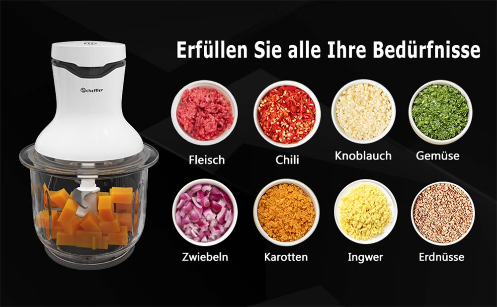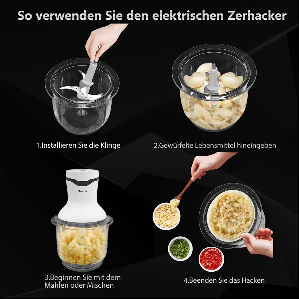 Elektrische Multizerkleinerer mit 4 robusten lebensmittelechtem 304 Edelstahlklingen ermöglichen es, durch Ober- und Untermessern, fast alle Arten von Lebensmitteln schnell und mühelos zu zerkleinern. Kein mühsames hacken mehr nötig!
