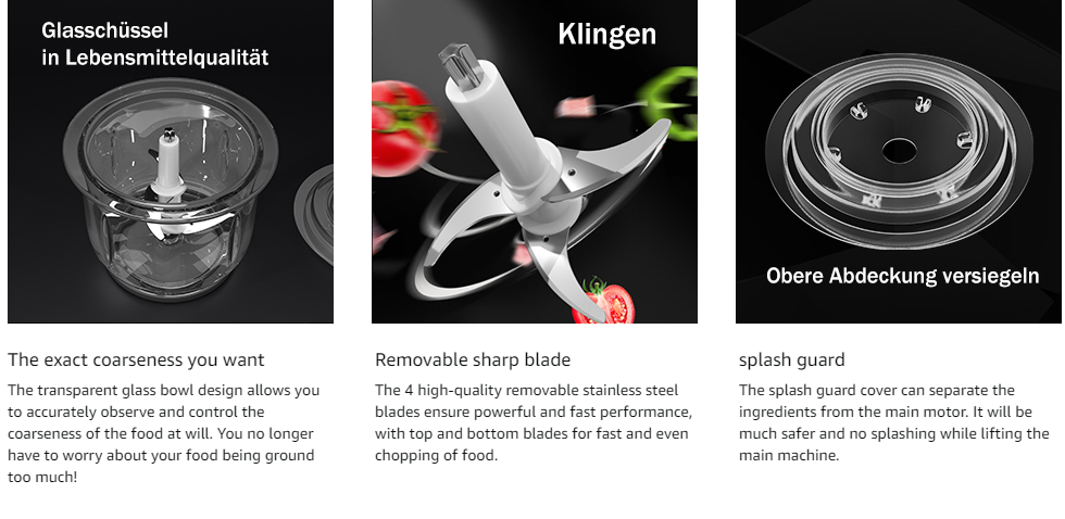 Der Zerkleinerer ist kompakt und leicht. Alle Teile (außer dem Motor) sind spülmaschinengeeignet. Wenn Sie Fragen zur Verwendung oder ein Qualitätsproblem haben, können Sie sich gerne an uns wenden.