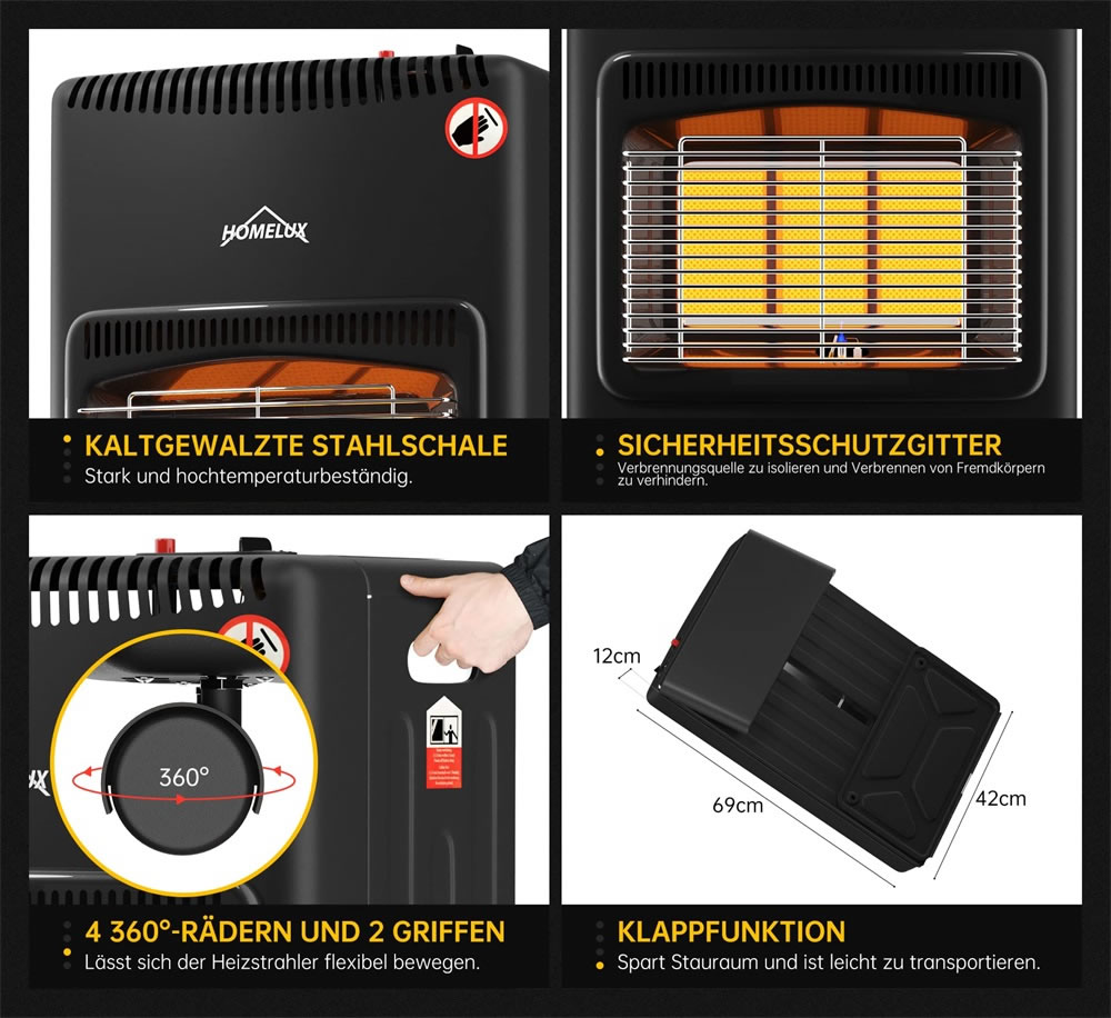 Kaltgewalzte Stahlschale, stark und hochtemperaturbeständig.Sicherheitsschutzgitter, um die Verbrennungsquelle zu isolieren und das Verbrennen von Fremdkörpern zu verhindern.Die Rückseite ist mit einer Trennwand ausgestattet, um die Sicherheit und Stabilität der großen Flasche (8-15kg) zu gewährleisten.Dank 4 360°-Rädern und 2 Griffen lässt sich der Heizstrahler flexibel bewegen.Die Klappfunktion spart Stauraum und ist leicht zu transportieren.