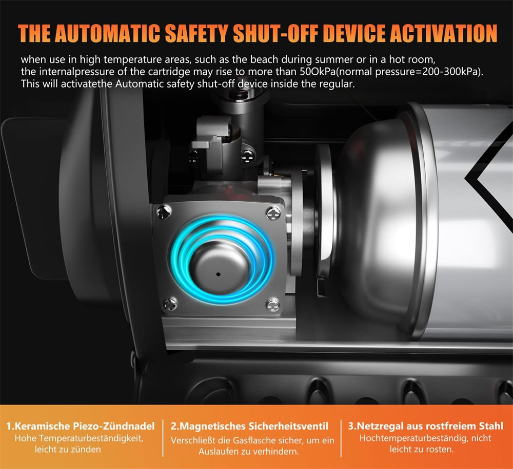 Einfach die Kartusche einsetzen und der Camping-Gasheizer ist einsatzbereit.Der Keramik-Zündstift ist mit dem Messing-Zündrohr für eine schnelle Zündung abgestimmt.Die Wärme kann einfach über den Knopf eingestellt werden.Edelstahl Stahlschutzgitter ist die Sicherheit gewährleistet.Das magnetische Sicherheitseisensaugventil nimmt die Tintenkartusche fester auf und ist empfindlicher Die energiesammelnde Verbrennungsplatte heizt sich schnell auf.