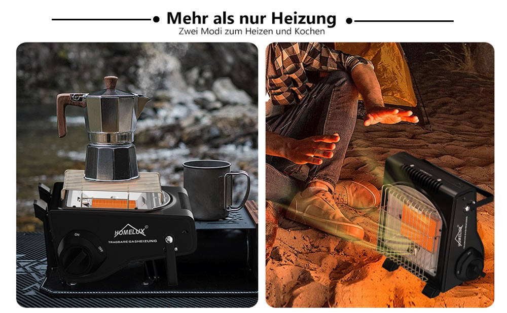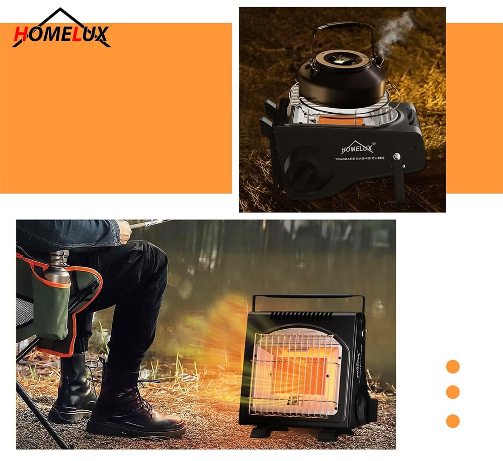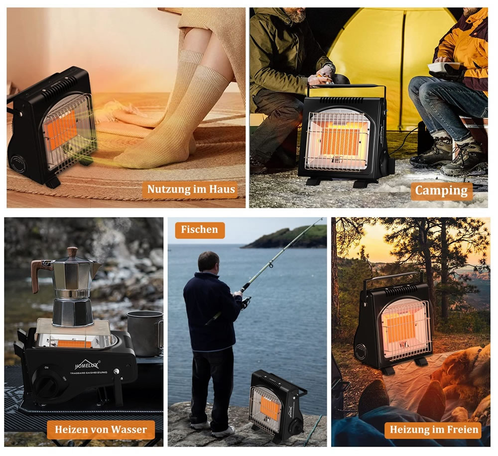 Der tragbare Gasheizer ist perfekt für Outdoor-Aktivitäten wie Camping, Angeln, Wandern, Zelten oder einfach nur zum Entspannen im Garten geeignet.Kann auch auf Baustellen, Höfen, Fabriken, Versorgungseinrichtungen und im Freien gebauten Umgebungen aufgestellt werden und sehen Sie sich mit Ihren Freunden ein spannendes Sportereignis an!