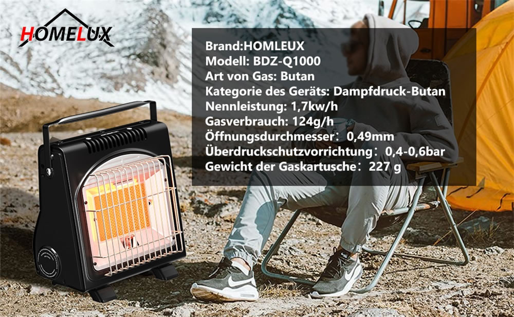1,7KW Gasheizung HOMELUX Gasheizung für innenräume Outdoor Gasheizer, Gasheizung Camping, Heizung Ohne Strom, Gasheizstrahler, Campingheizer, Heizstrahler,BDZ-Q1000