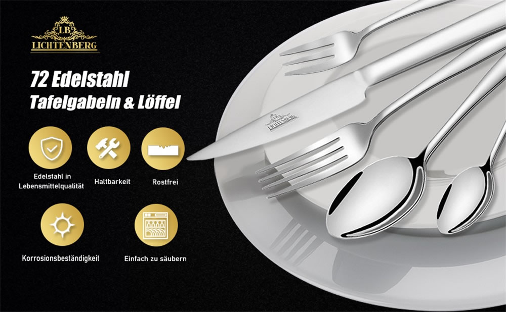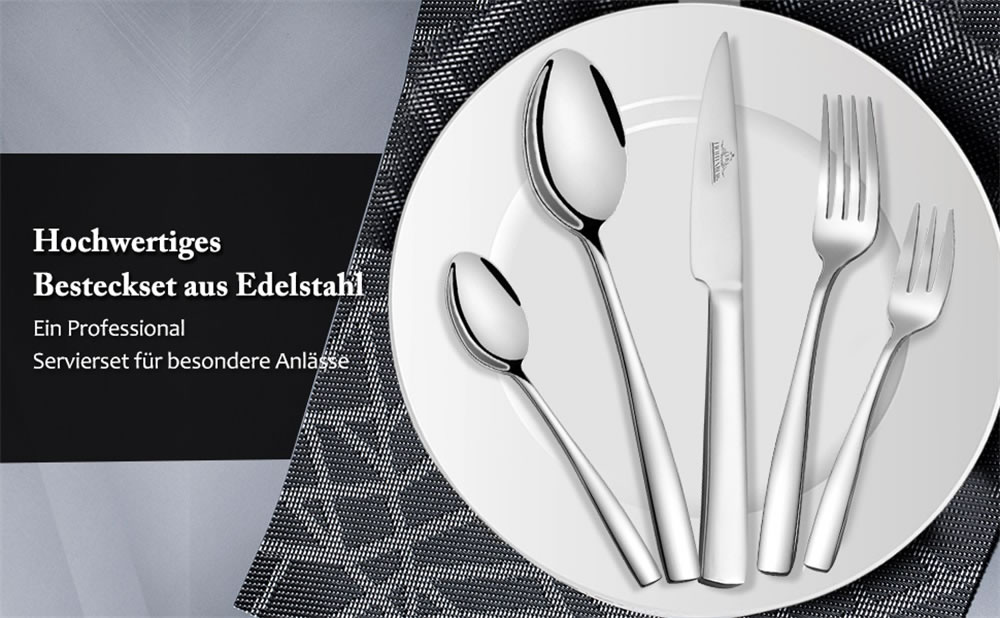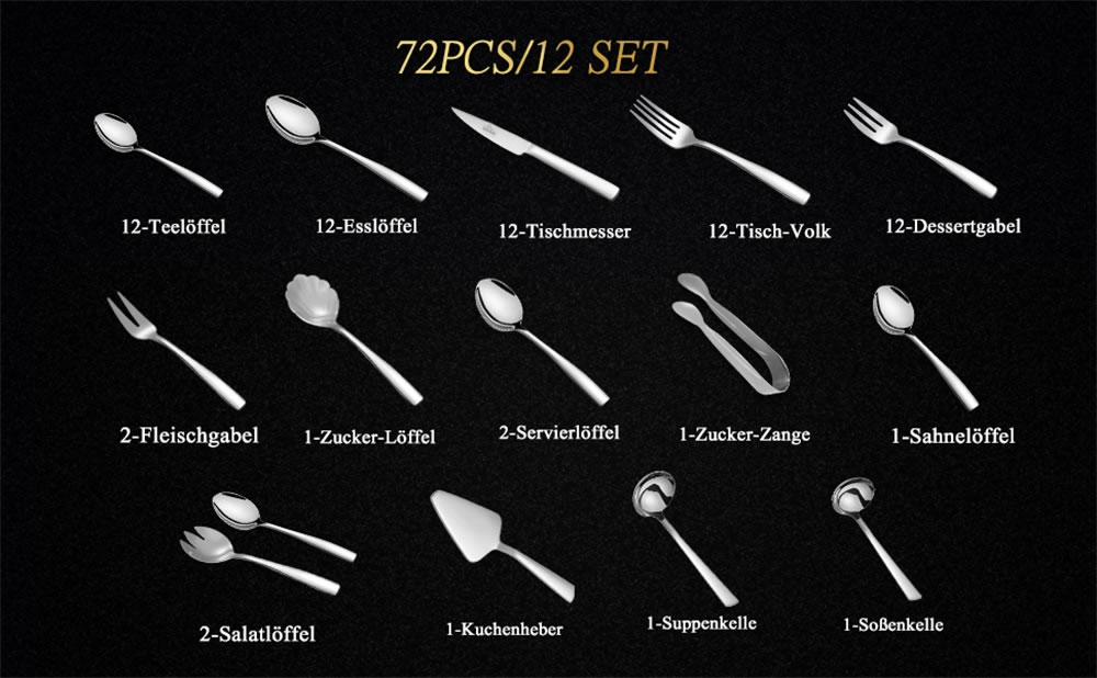 Unser 72-teiliges Besteckset für 12 Personen, das Tafelgabeln, 12 Tafellöffel, 12 Tafelmesser und 12 Dessert-/Teelöffel enthält, perfekt für den täglichen Gebrauch von Familien oder Restaurants.