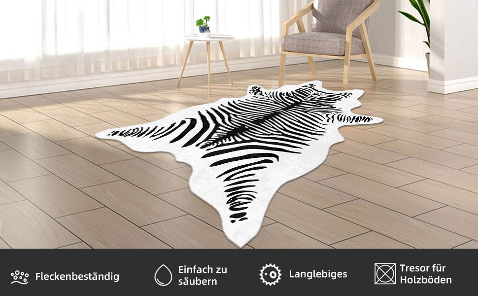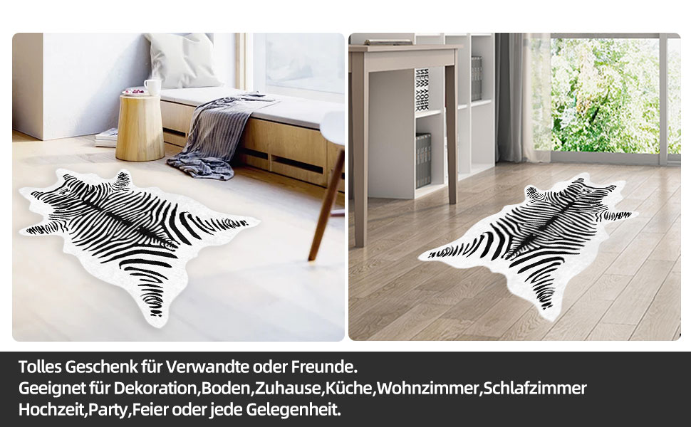 Die Länge x Höhe dieser Teppich beträgt 130 x 190cm. Zebra Teppich sehen stilvoll und bequem aus. Die Qualität und Verarbeitung dieser Fußmatten sind sehr gut. Es kann auch Ihren Verwandten oder Freunden als Einweihungsgeschenk gegeben werden.