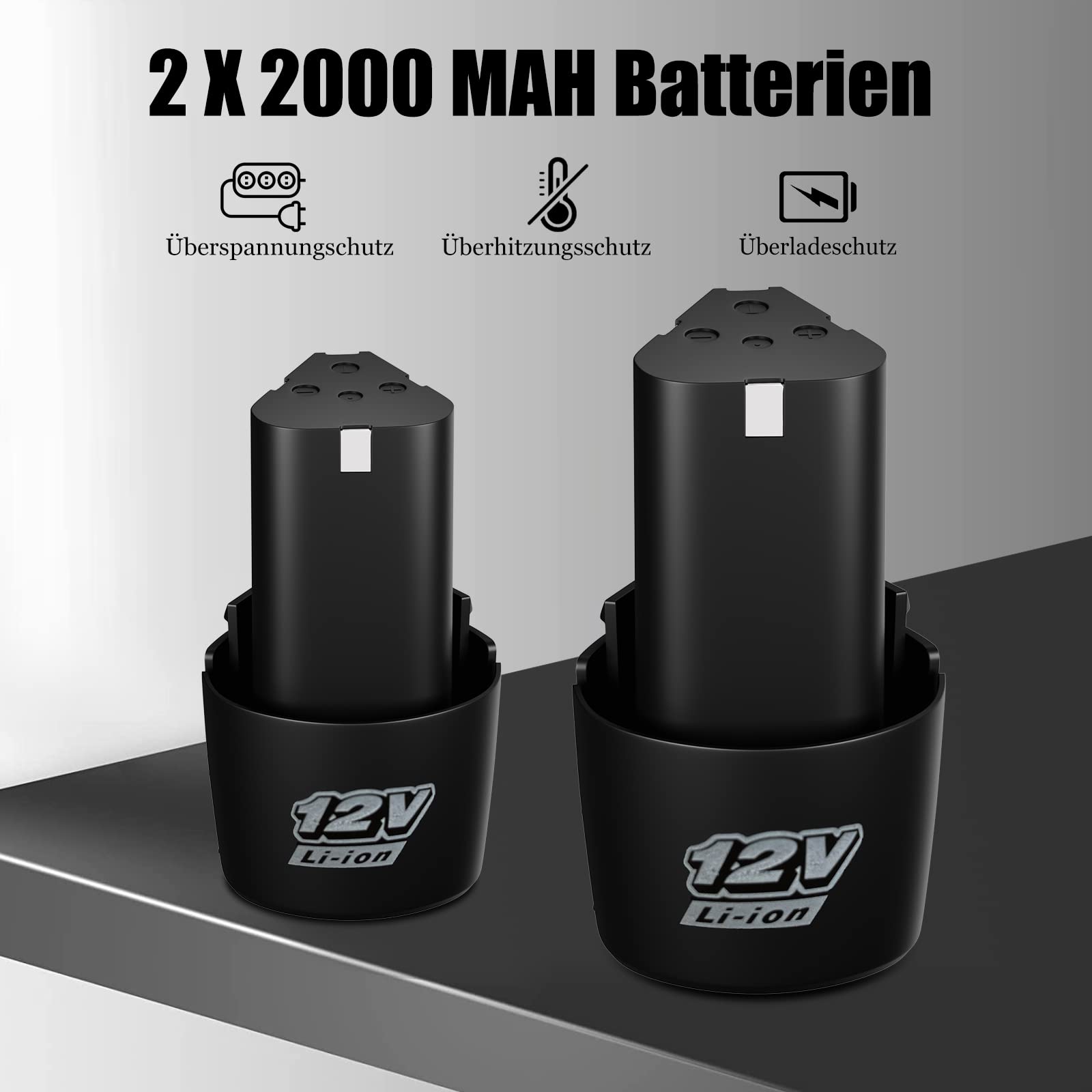 2er-Pack 12 V herausnehmbarer und wiederaufladbarer 2000-mAh-Lithium-Akku, selbstüberladende Li-Ionen-Akkus mit Temperaturschutz sorgen für eine viel längere Akkulaufzeit.