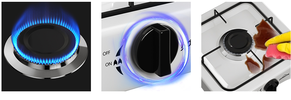 Der Metallrost des Gaskochfelds besteht aus Aluminiumguss und kann zur Reinigung herausgenommen werden. Wir bieten Ihnen Brennerköpfe in verschiedenen Größen an, um Ihre Anforderungen an die gleichzeitige Zubereitung verschiedener Speisen zu erfüllen. Auch die Pfannen mit Griffen lassen sich leicht abstellen.