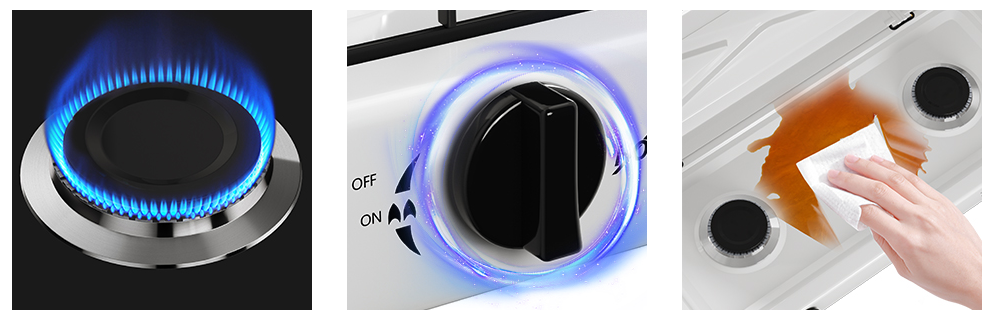 Der Metallrost des Gaskochfelds besteht aus Aluminiumguss und kann zur Reinigung herausgenommen werden. Wir bieten Ihnen Brennerköpfe in verschiedenen Größen an, um Ihre Anforderungen an die gleichzeitige Zubereitung verschiedener Speisen zu erfüllen. Auch die Pfannen mit Griffen lassen sich leicht abstellen.