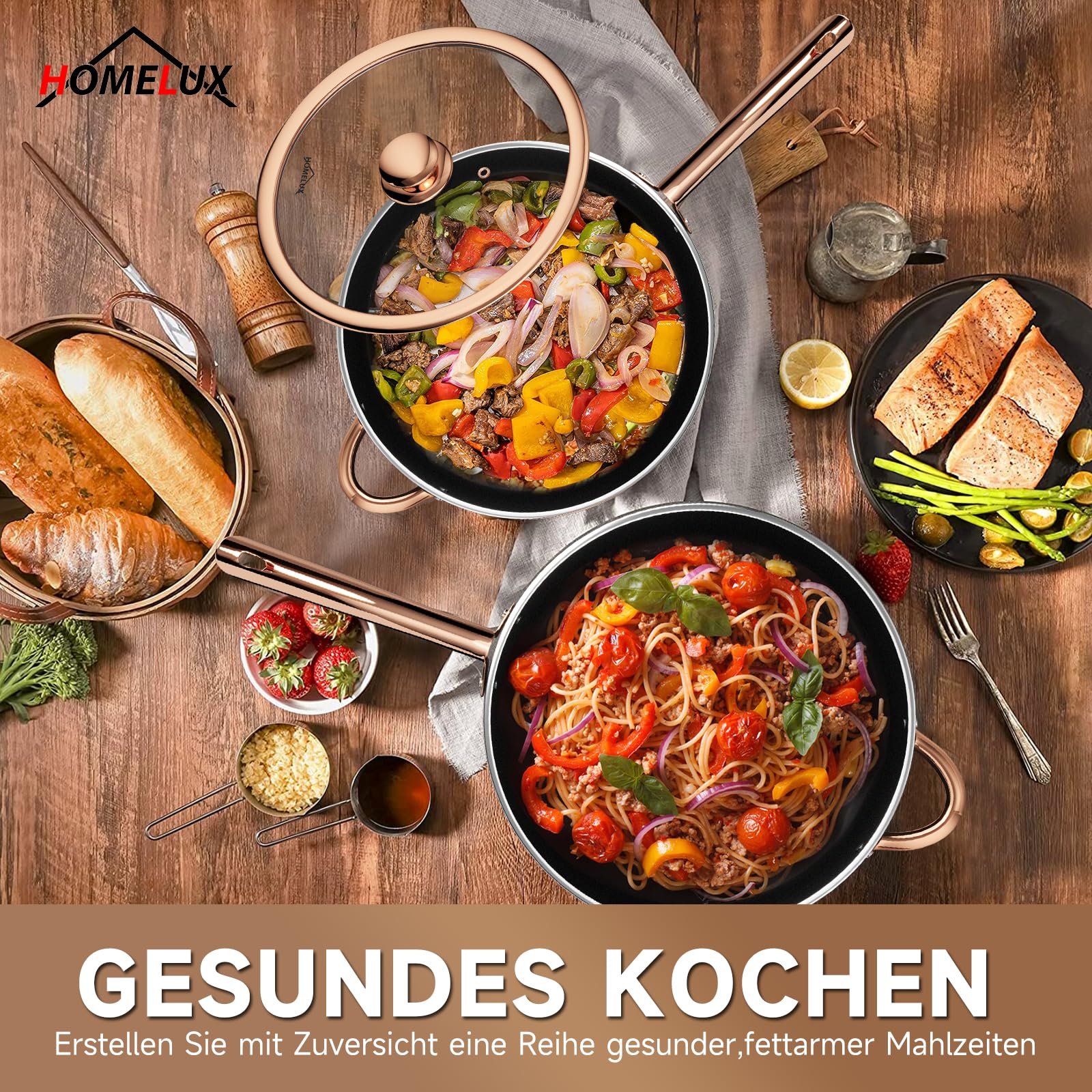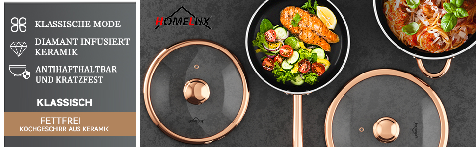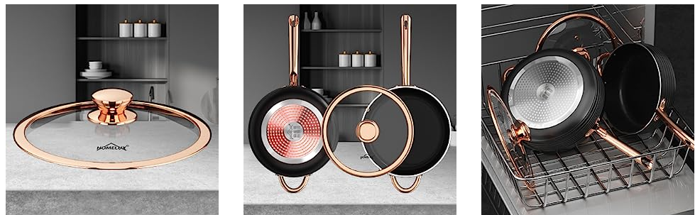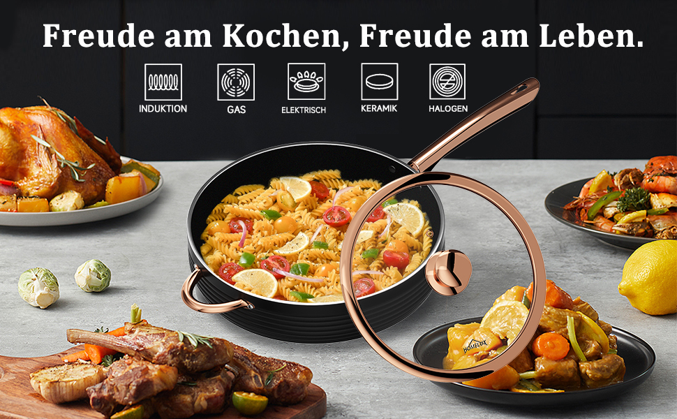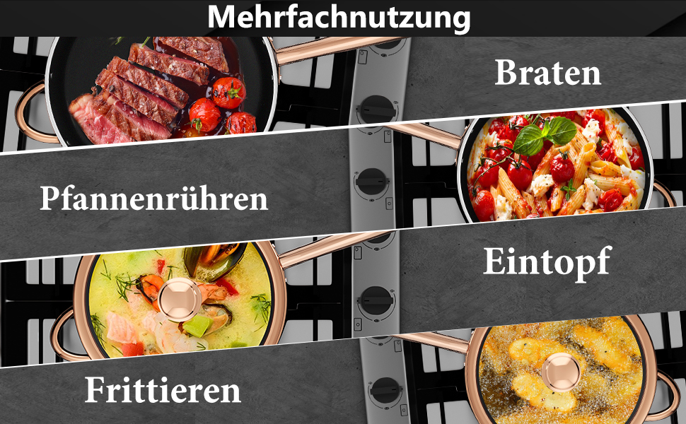 Das Kochgeschirrset verfügt über eine stilvolle gerippte Oberfläche und einen robusten Aluminiumkörper mit einer 3 mm dicken Konstruktion. Der sich schnell aufheizt und die Wärme gleichmäßig verteilt, um hervorragende Kochergebnisse zu erzielen. Es ist kompatibel mit Gas-, Elektro-, Keramik-, Glas-, Herd-, Induktionskochfeldern und mehr.
