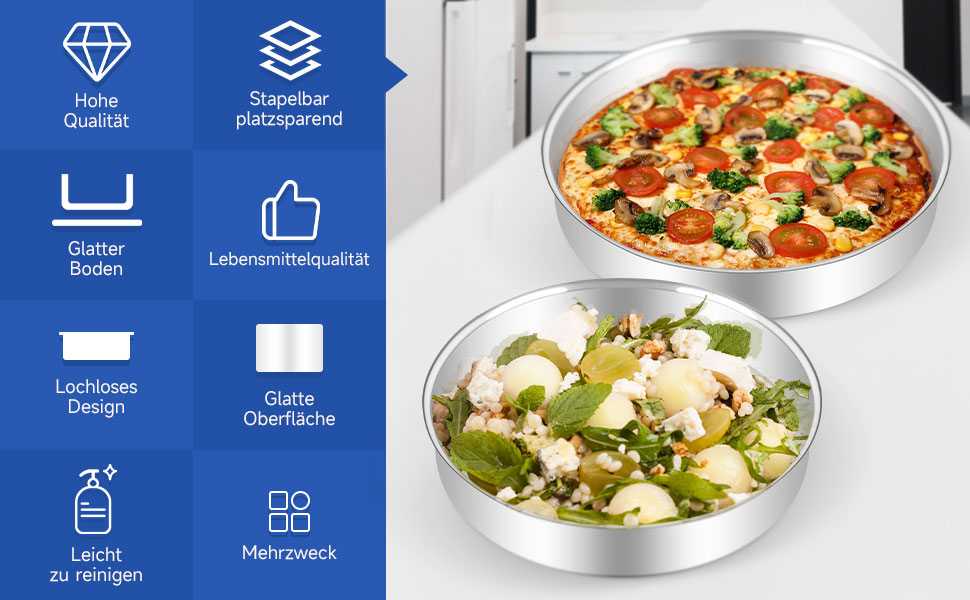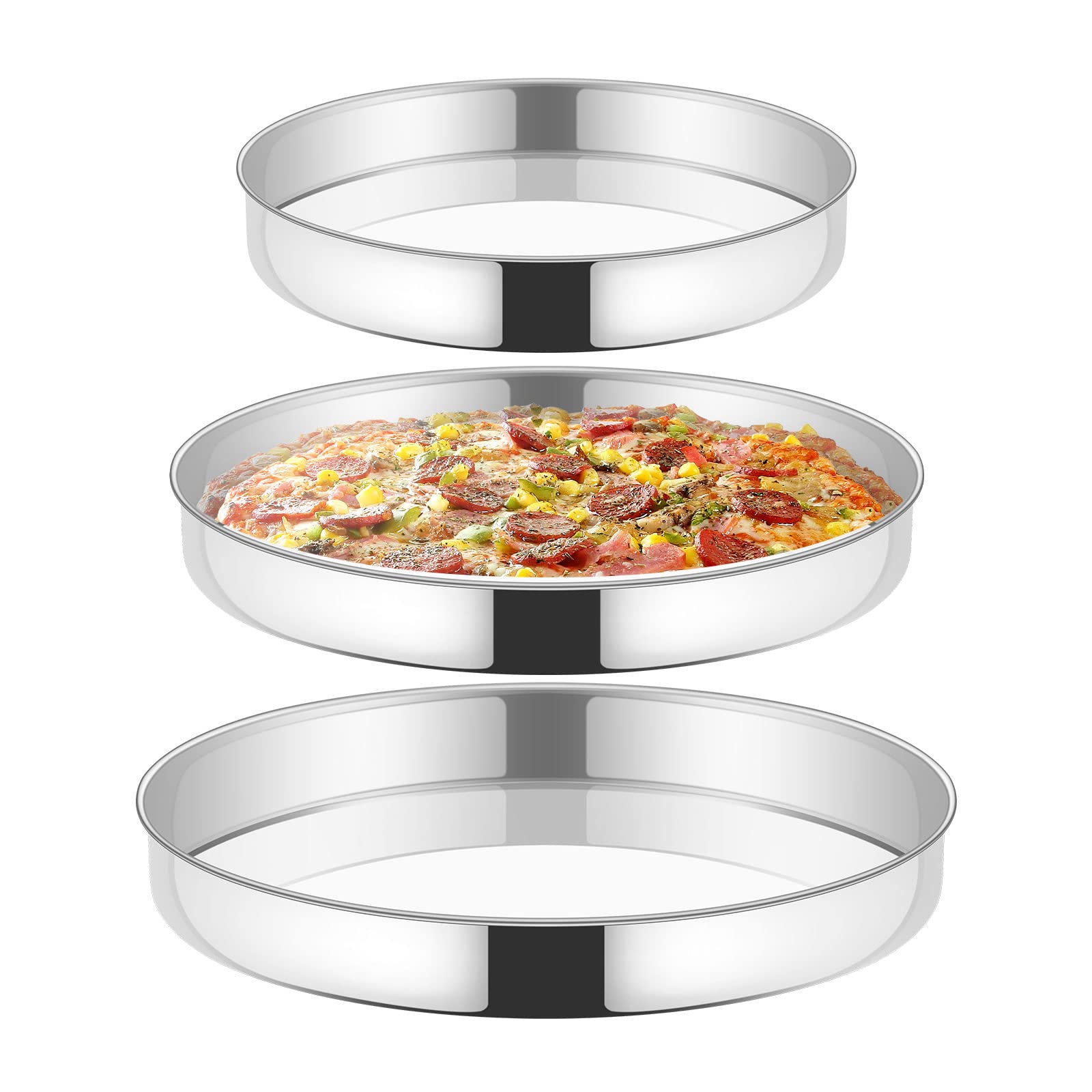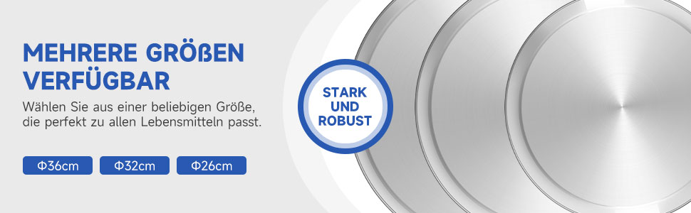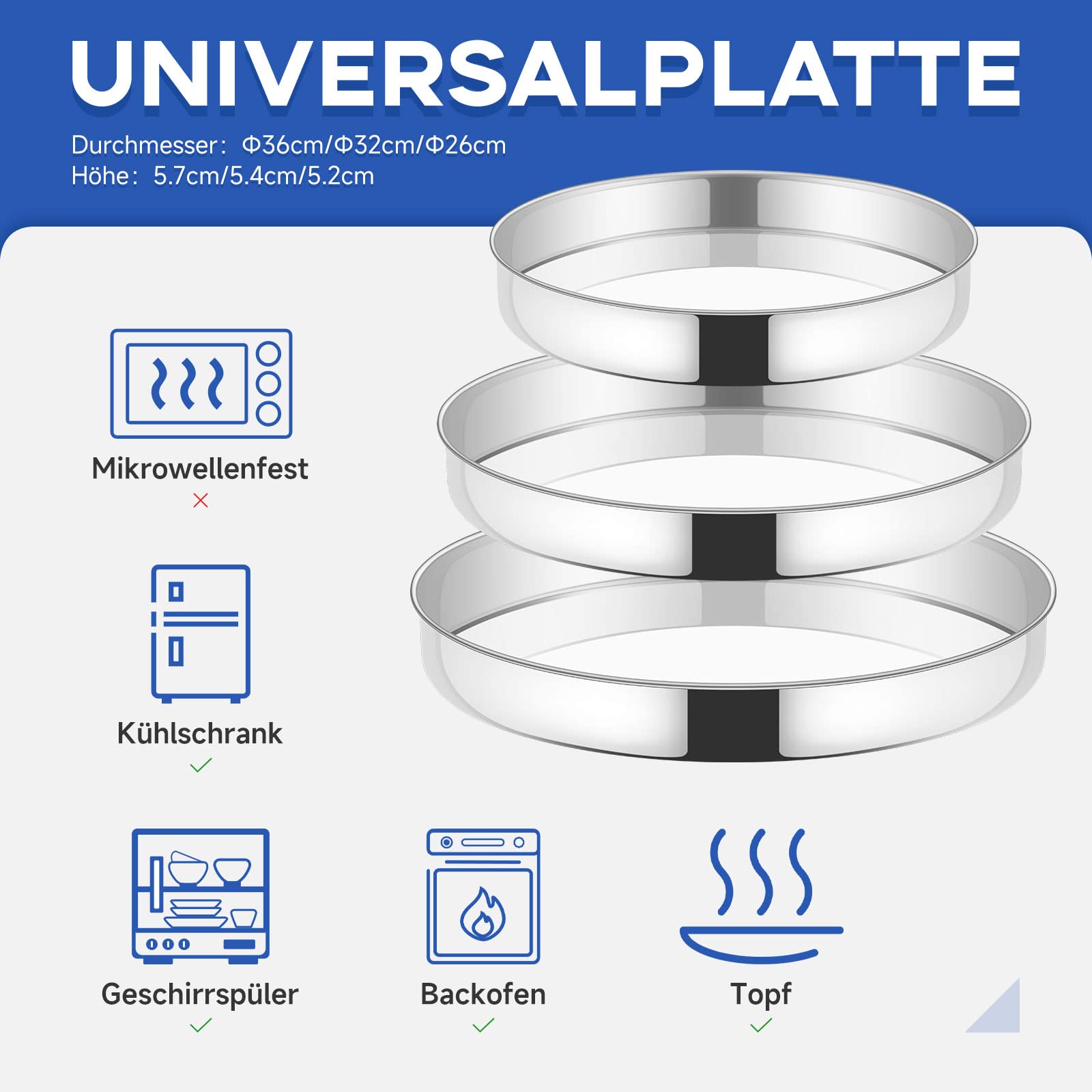 Φ26cm/Φ32cm/Φ36cm; Das 3-teilige Set in verschiedenen Größen eignet sich perfekt zum Zubereiten verschiedener Arten von Kuchen, Pizza, Grill,Maisbrot usw. zum Backen/Braten/Servieren; Holen Sie sich Backformen in 3 Größen auf einmal, um Ihren täglichen Kochbedarf zu decken.