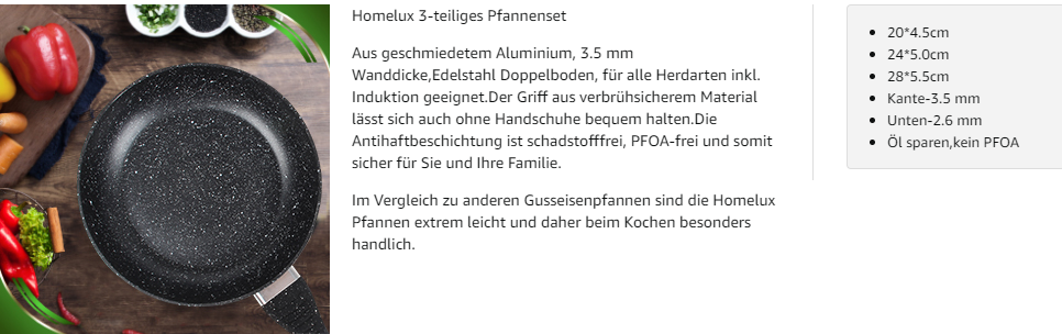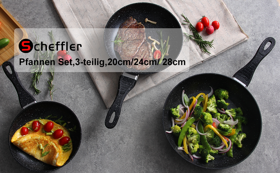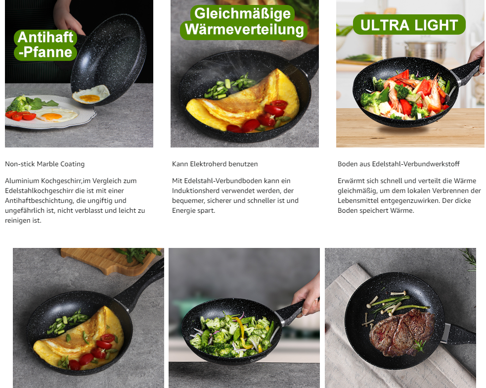 Pfannen bestehen aus Aluminiumdruckguss, der die Wärme schnell und gleichmäßig leitet und langlebig und stark ist. Wodurch es möglich ist, Lebensmittel mit sehr wenig Öl anzubraten, um viel Energie zu sparen. Gleichzeitig lassen sich Fleisch, Fisch und Gemüse besonders knusprig anbraten.