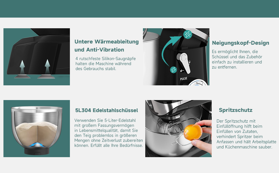 Die 5L Edelstahlschüssel bietet ausreichend Platz für jede Zubereitung. Der integrierte Spritzschutz erleichtert die Verarbeitung von Zutaten ohne Chaos.