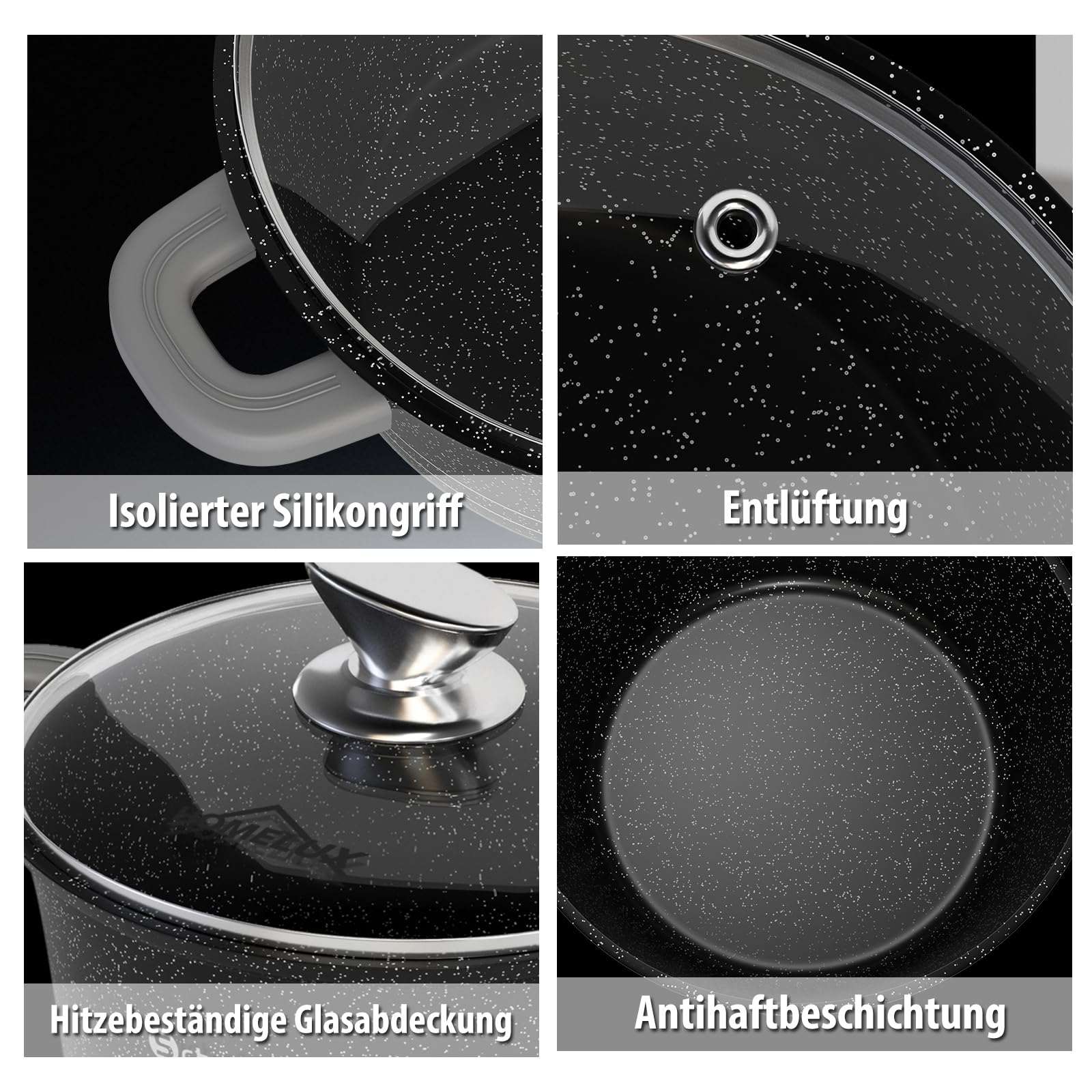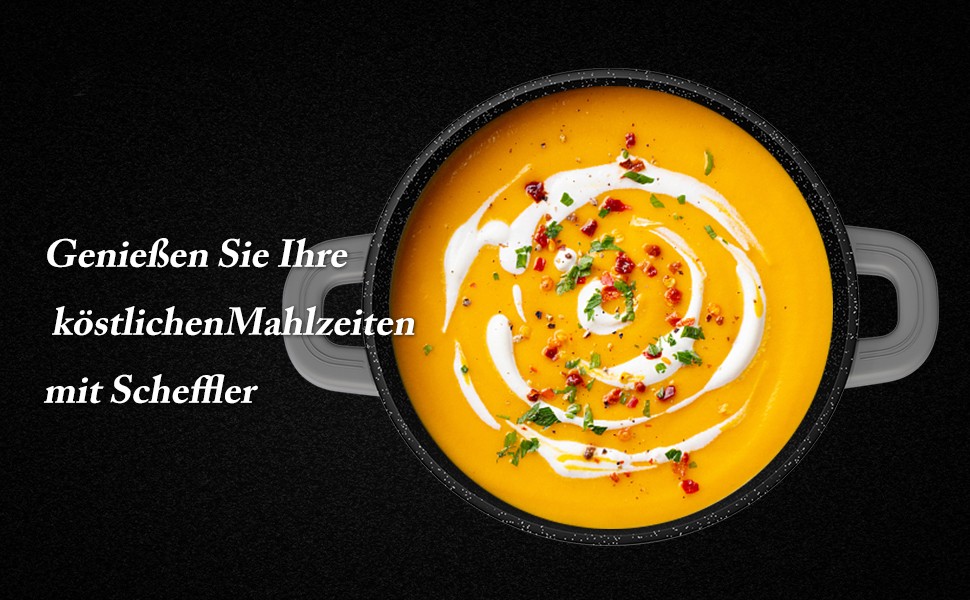 Der robuste und bequeme Griff bleibt beim Kochen kühl. Und der Doppelgriff des Topfes fördert einen stabilen, sicheren und bequemen Griff beim Heben oder Tragen. Der hochtemperaturbeständige Glasdeckel ermöglicht es, den Garzustand der Speisen jederzeit zu überprüfen, was das Kochen sehr angenehm macht. Die Dampföffnung am Deckel fördert die Zirkulation von Wärme und Feuchtigkeit.