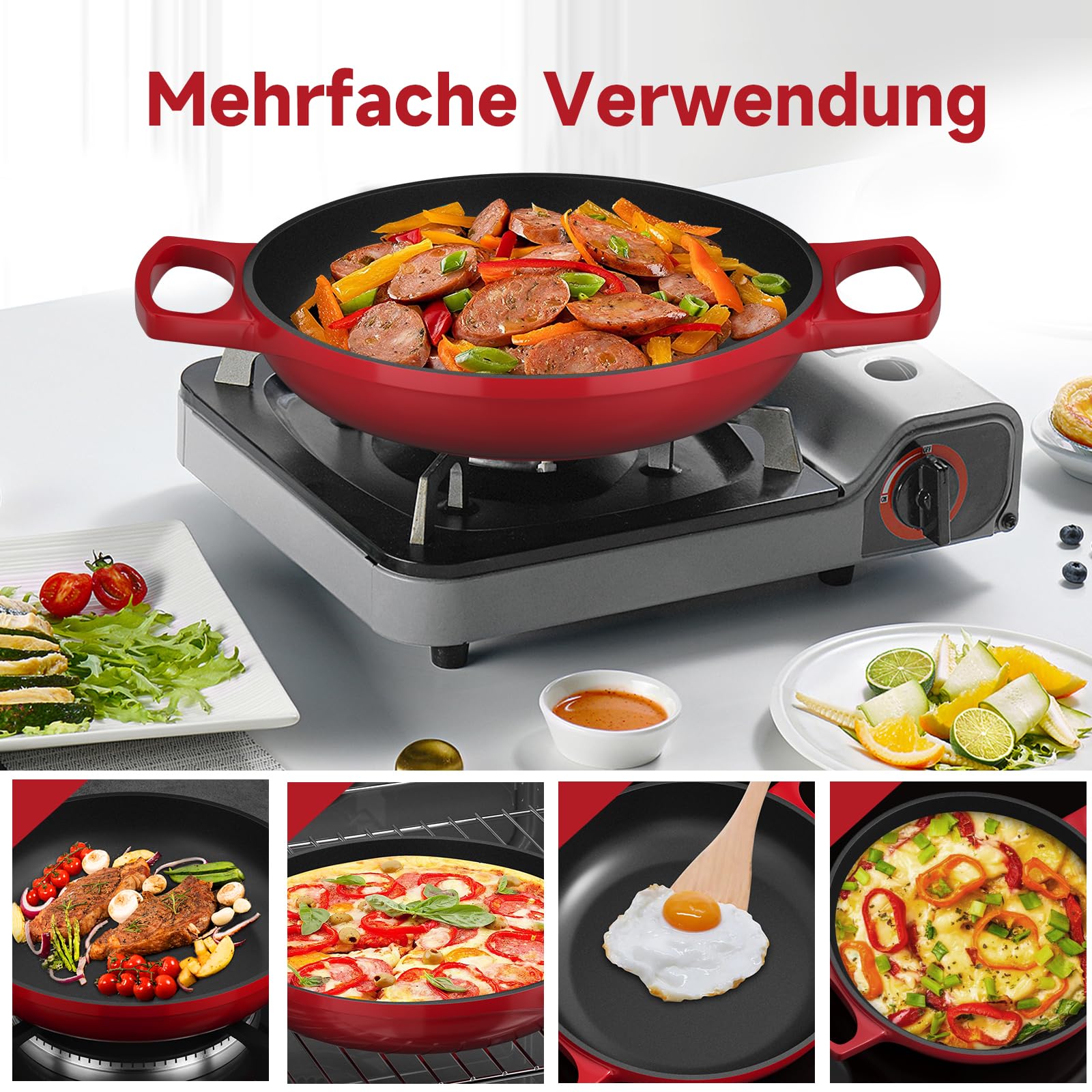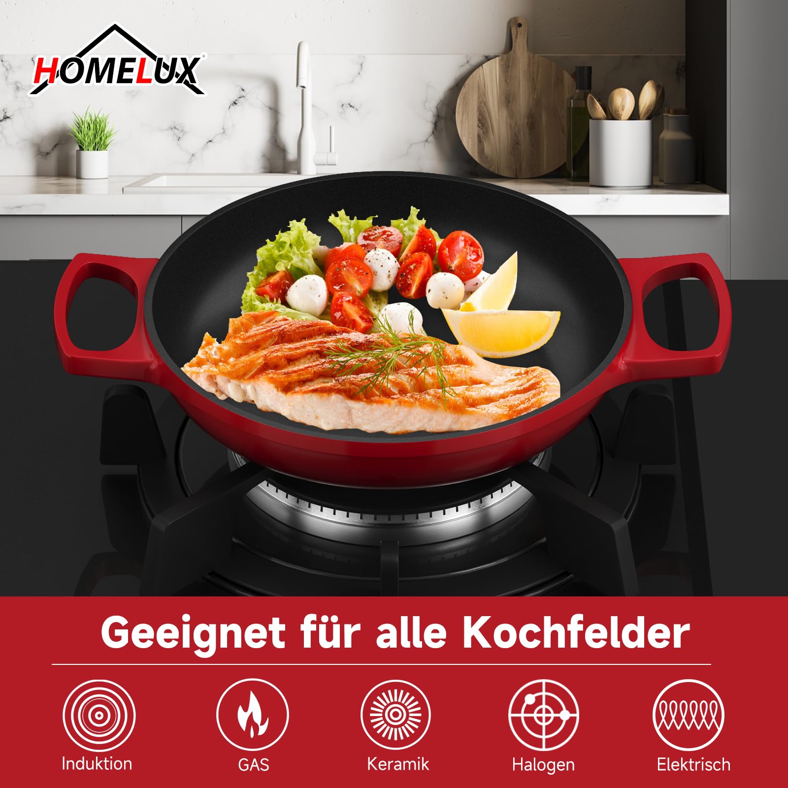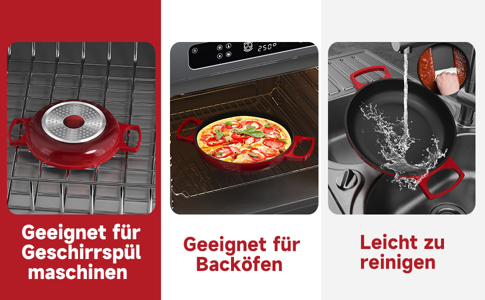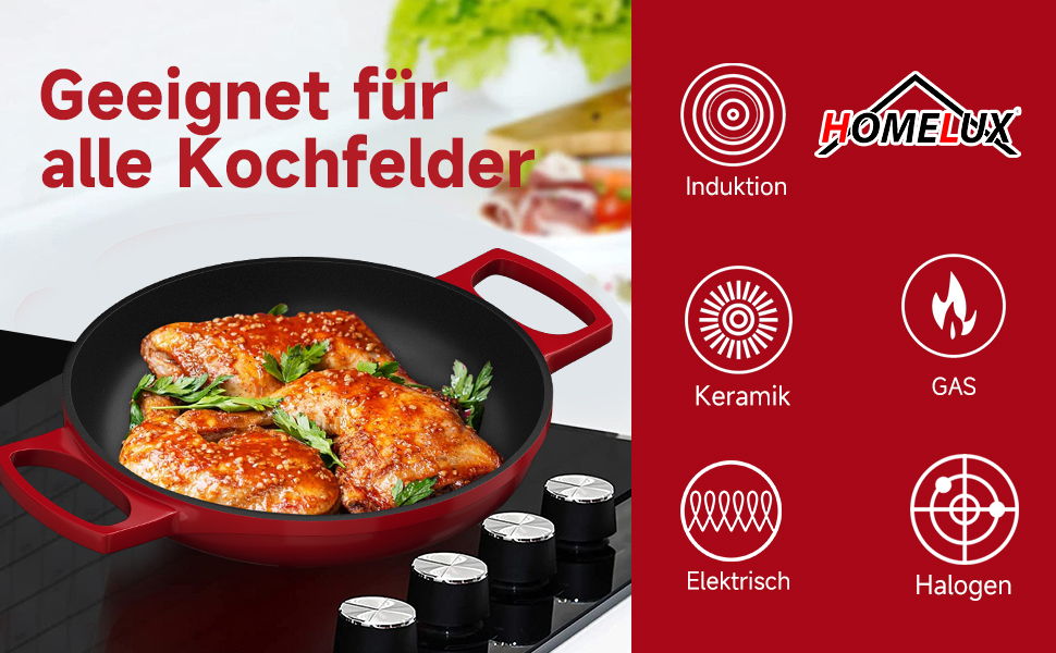 Egal, ob Sie ein Gas-, Elektro-, Induktions- oder Glaskochfeld haben, diese Pfanne ist so konzipiert, dass sie auf allen Herdarten nahtlos funktioniert.