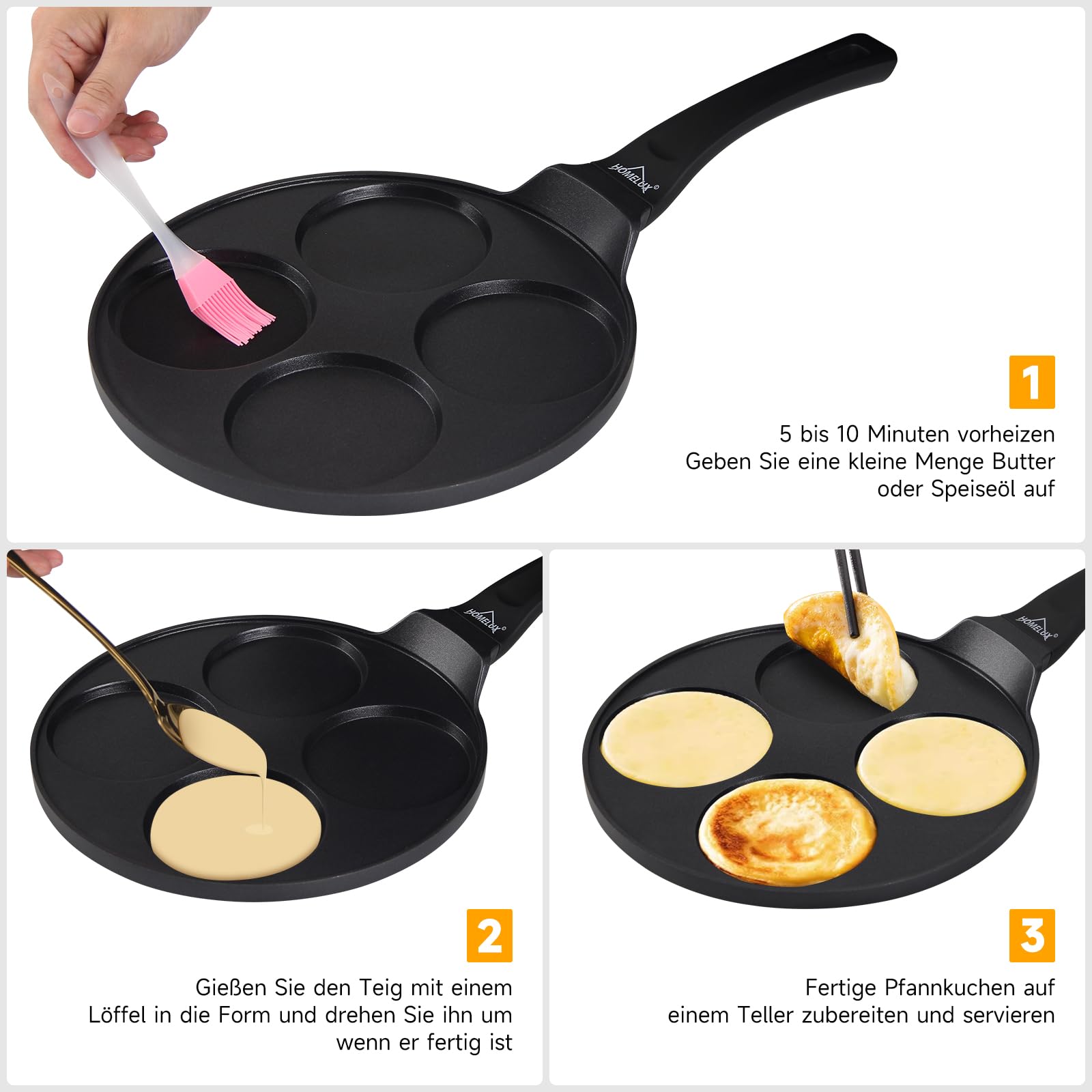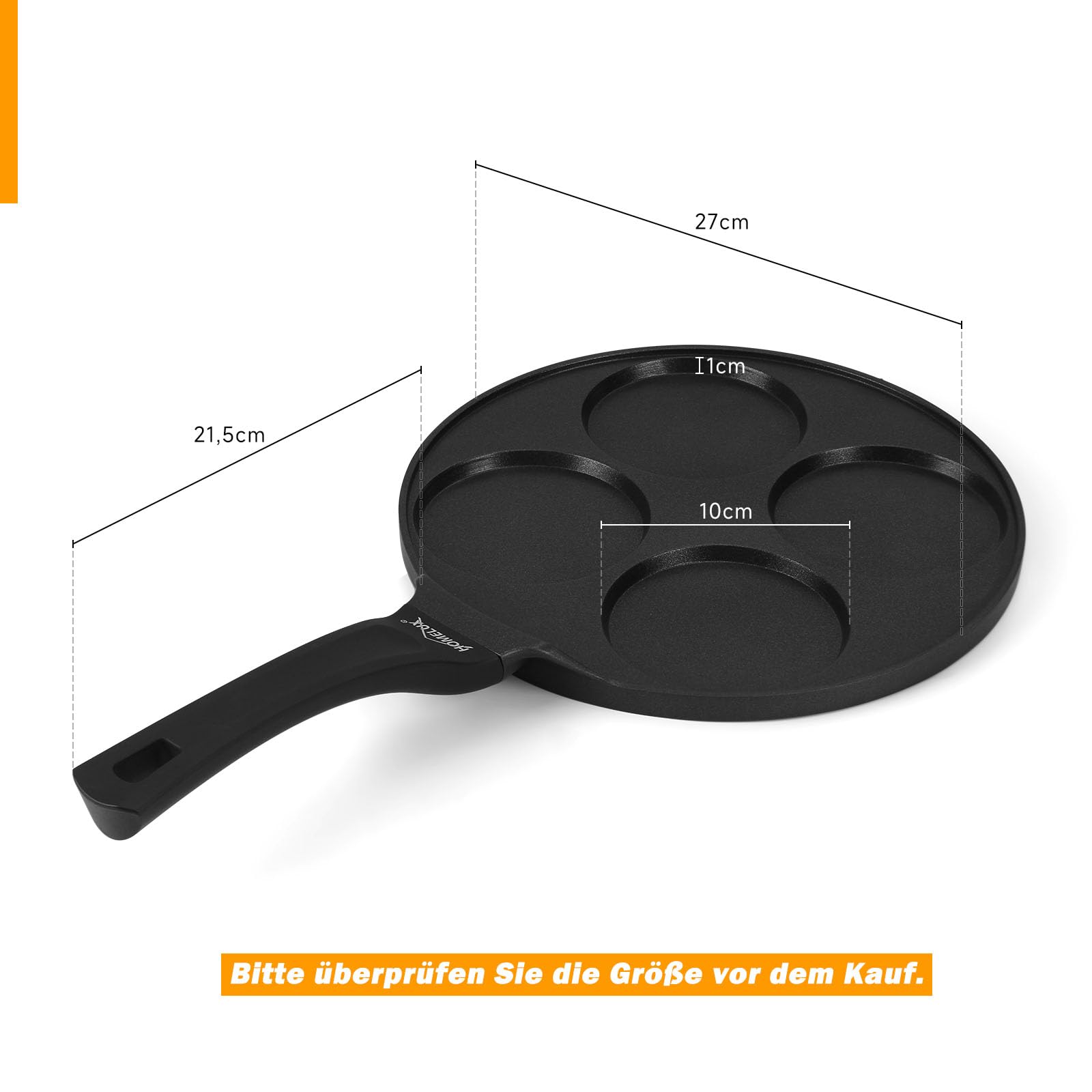 Mit einem Durchmesser von 10,5 Zoll und einer Höhe von 1/3 Zoll verfügt diese Pancake Pfanne über vier separate Pfanne für Eeierpfanne, von denen jede 4 Zoll misst. Die Gesamtlänge einschließlich des griffs beträgt 19 Zoll. Perfekt für die Zubereitung von Frühstücksspezialitäten wie Pfannkuchen, Eiern, Crêpes, Blinis und Blintzes.Bitte überprüfen Sie die Größe vor dem Kauf.