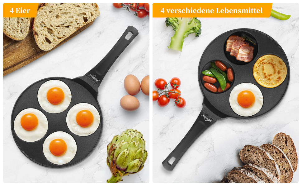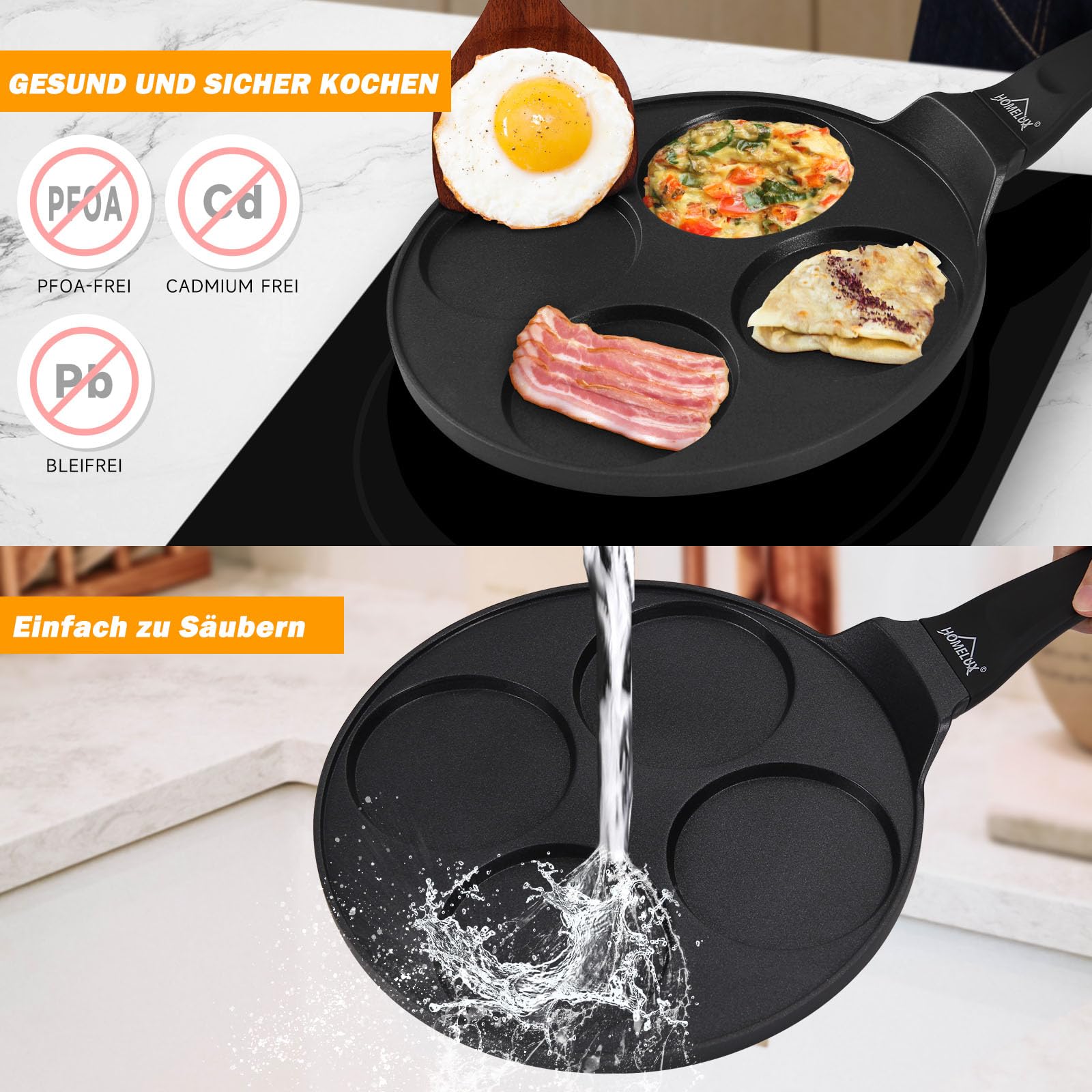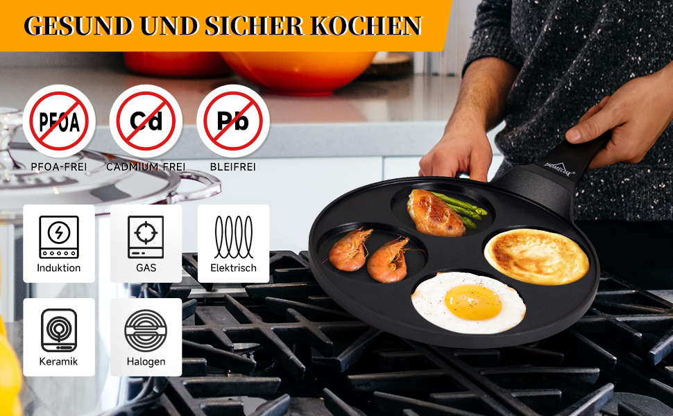 Die Spiegeleipfanne ist mit einer hochwertigen lebensmittelechten Beschichtung hergestellt, zu 100 % frei von PFOA, ohne Blei oder Cadmium. Das Antihaft-Merkmal maximiert seine Vorteile beim Kochen und Reinigen und reduziert Aufwand und Zeit im Vergleich zu herkömmlichen Pfanne erheblich.
