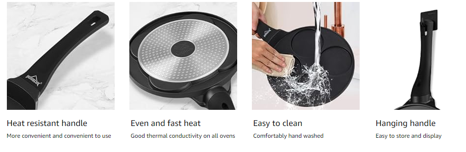 Der hochmagnetische leitfähige Edelstahlboden ermöglicht es der Pfannkuchenpfanne, auf allen Herdarten zu funktionieren, einschließlich Induktion. Geeignet für alle Heizmethoden. Es wird empfohlen, bei schwacher Hitze zu kochen, um die Beschichtung zu schützen.