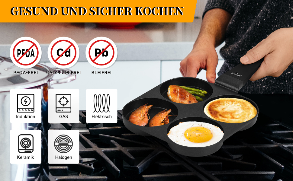 Die Spiegeleipfanne ist mit einer hochwertigen lebensmittelechten Beschichtung hergestellt, zu 100 % frei von PFOA, ohne Blei oder Cadmium. Das Antihaft-Merkmal maximiert seine Vorteile beim Kochen und Reinigen und reduziert Aufwand und Zeit im Vergleich zu herkömmlichen Pfanne erheblich.