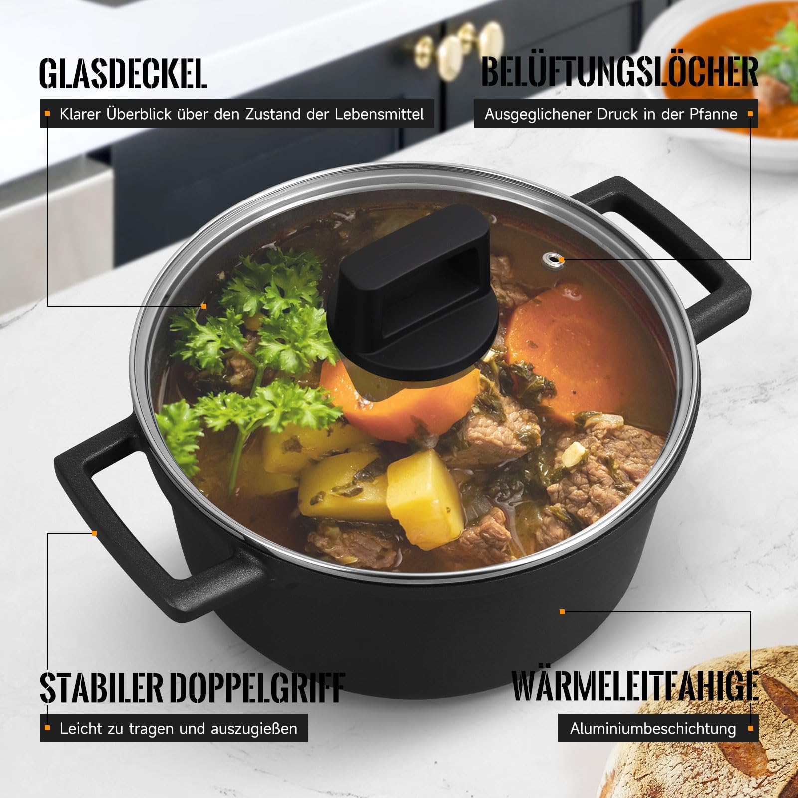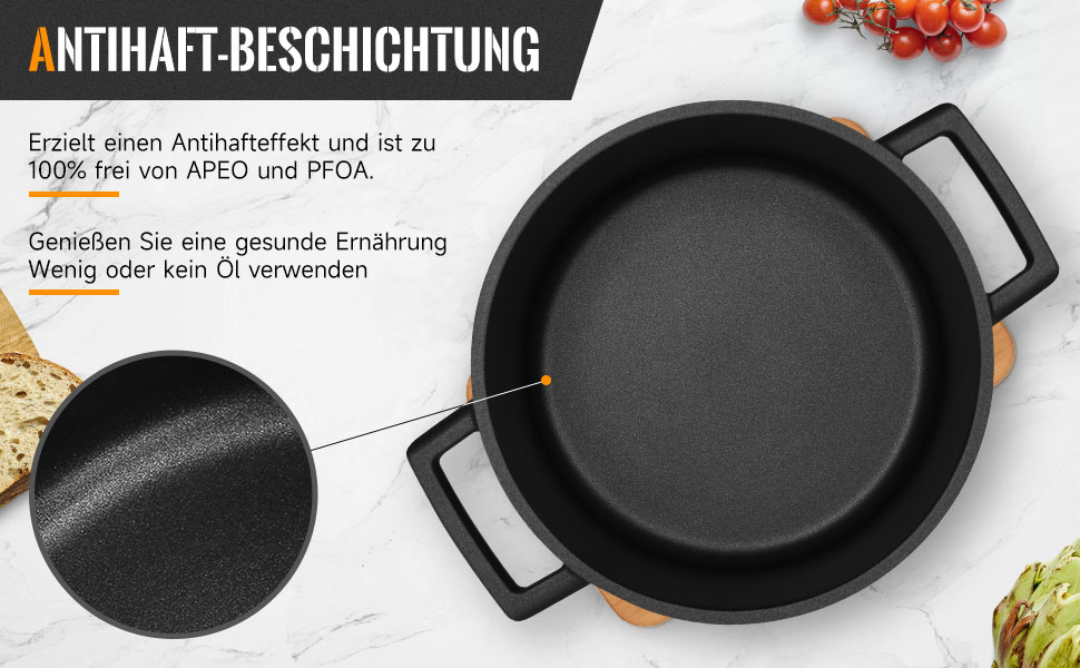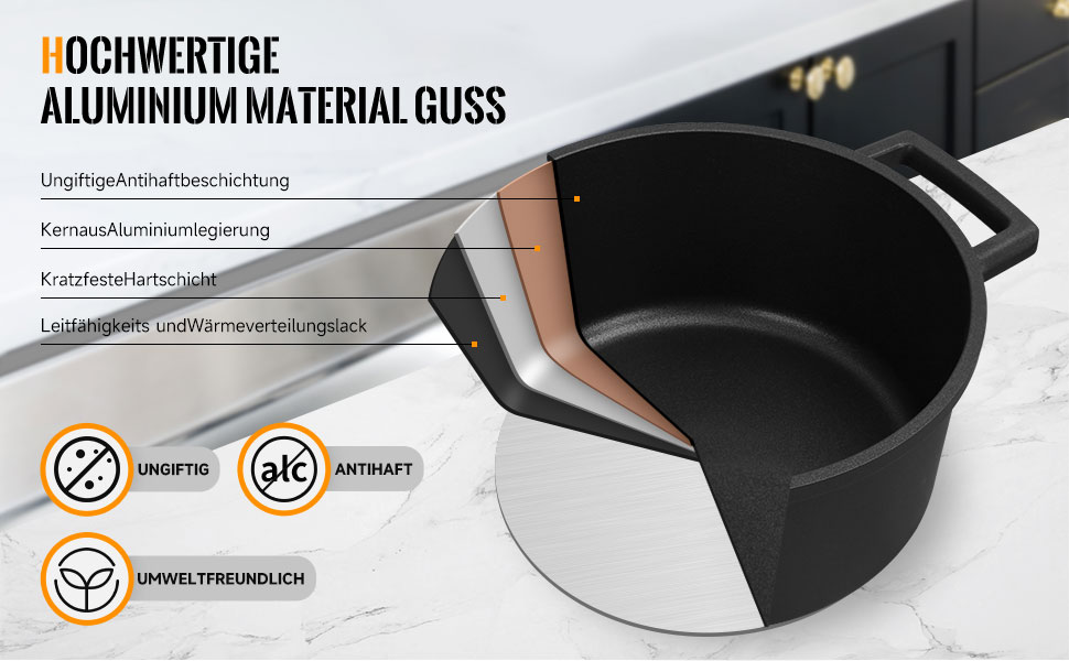 Die fortschrittliche Druckgusstechnologie macht den verdickten Aluminiumtopf sehr robust. Die Alugusstopf sorgt für eine schnelle und gleichmäßige Wärmeverteilung beim Kochen und spart so Zeit und Mühe.