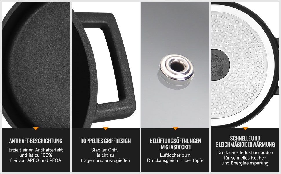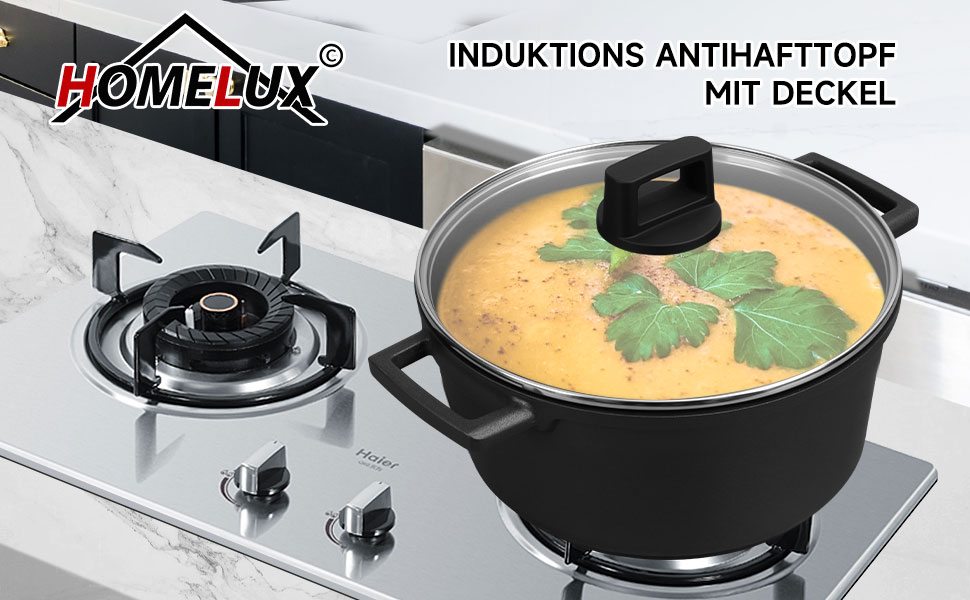 Der Induktionssockel aus Verbundwerkstoff ist für alle Herdarten geeignet, ob Gas, Induktion, Keramik oder Halogen, Sie brauchen sich keine Gedanken über die Kompatibilität zu machen, die homelux Kochtopf sind für jeden Haushalt geeignet.