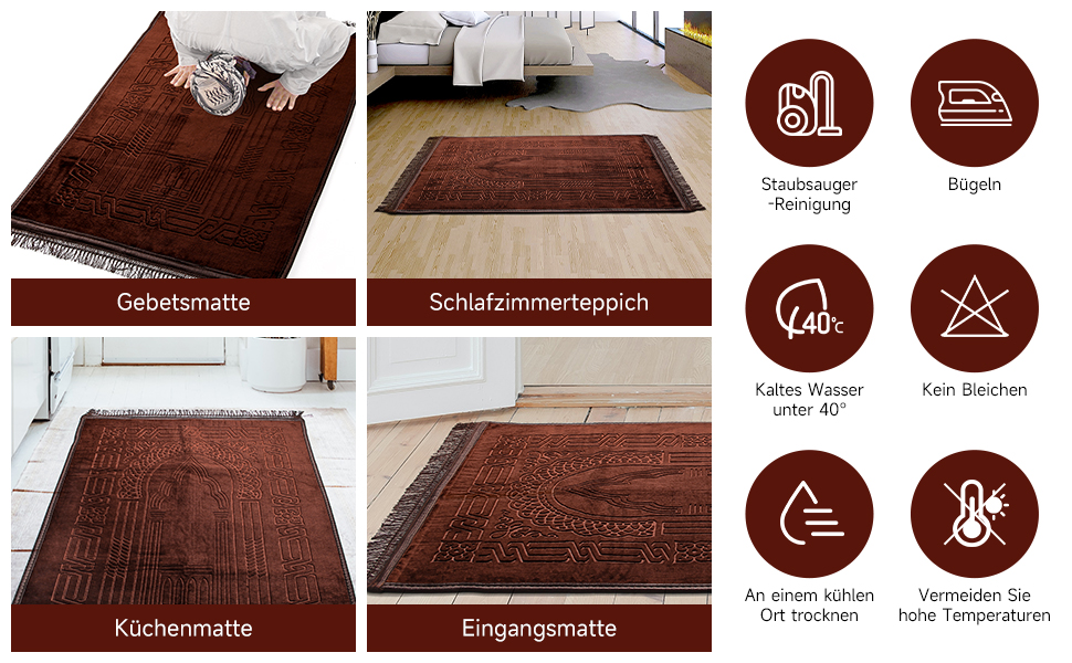 Unsere Gebetsteppich ist mit einem 3D getufteten Uni-Muster entworfen und ist in vier Farben erhältlich. Beachten Sie, dass das Muster nicht auswählbar ist. Wir stellen Ihnen zufällige Muster zur Verfügung, und jedes Gebetsteppich wird Sie überraschen.