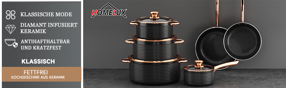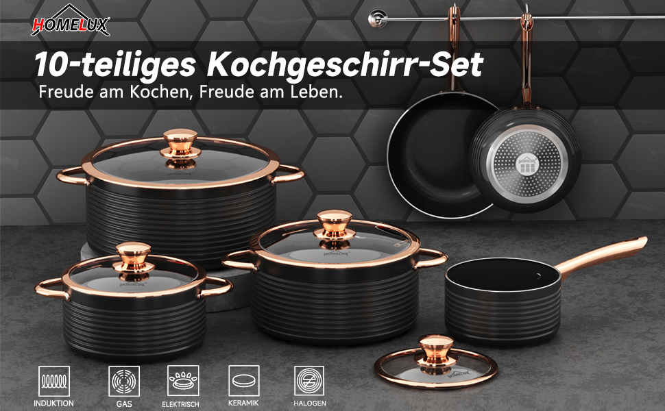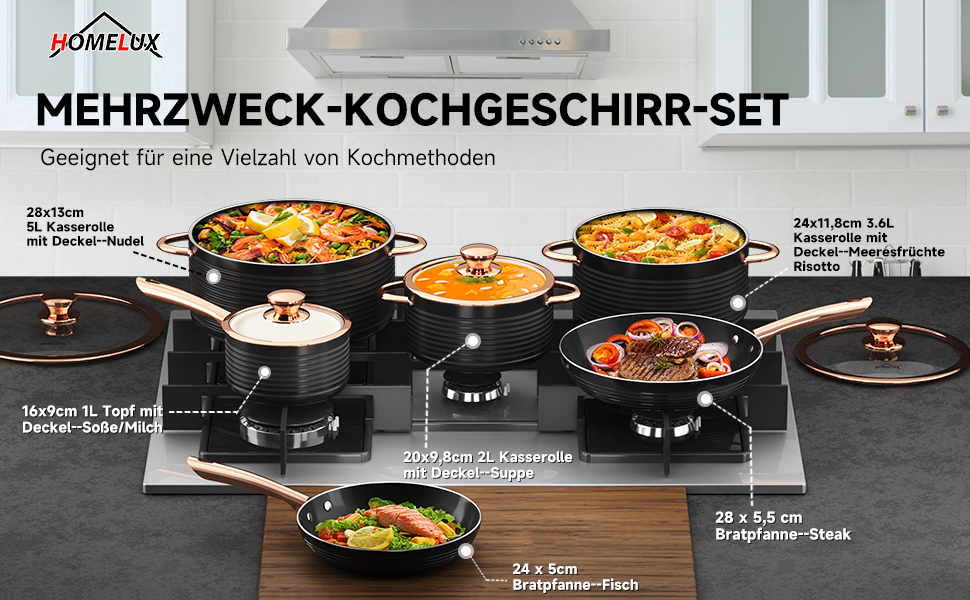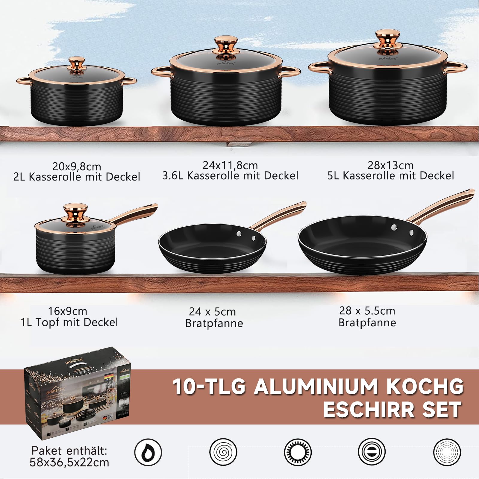 Dieses stilvolle 10-teilige Kochgeschirr-Set von HOMELUX enthält alles, was Sie zum täglichen Kochen brauchen: 16x9cm Soßenpfanne mit Deckel;20 x 9,8 cm Kasserolle mit Deckel;24 x 11,8 cm Kasserolle mit Deckel;28x13cm Kasserolle mit Deckel;24x5cm Bratpfanne;28 x 5,5 cm Bratpfanne
