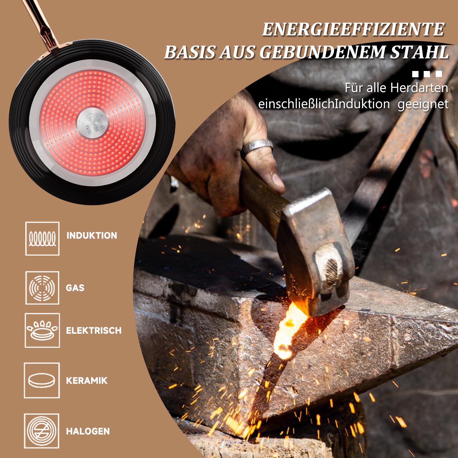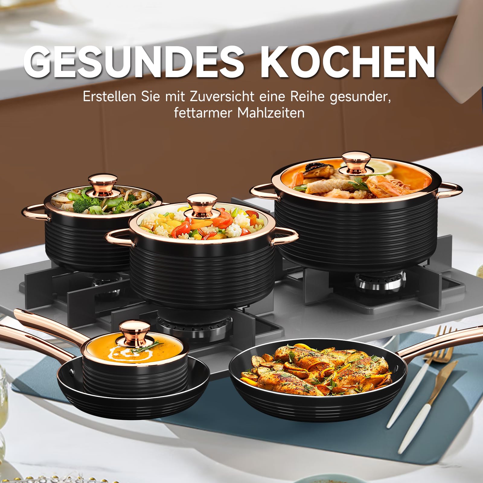 Das Kochgeschirrset verfügt über eine stilvolle gerippte Oberfläche und einen robusten Aluminiumkörper mit einer 3 mm dicken Konstruktion. langlebig und verwindungssteif, mit einem dreischichtigen Verbundboden, der sich schnell aufheizt und die Wärme gleichmäßig verteilt, um hervorragende Kochergebnisse zu erzielen. Es ist kompatibel mit Gas-, Elektro-, Keramik-, Glas-, Herd-, Induktionskochfeldern und mehr.