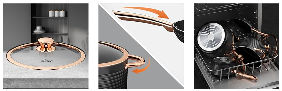 jede Pfanne, mit Ausnahme der Bratpfanne, verfügt über einen stabilen, belüfteten Glasdeckel mit hitzebeständigem Hartglasdeckel, um den Kochfortschritt leicht zu überwachen. Das professionelle Haushaltspfannenset verfügt über robuste, genietete Griffe für Komfort und Stabilität während des Gebrauchs.