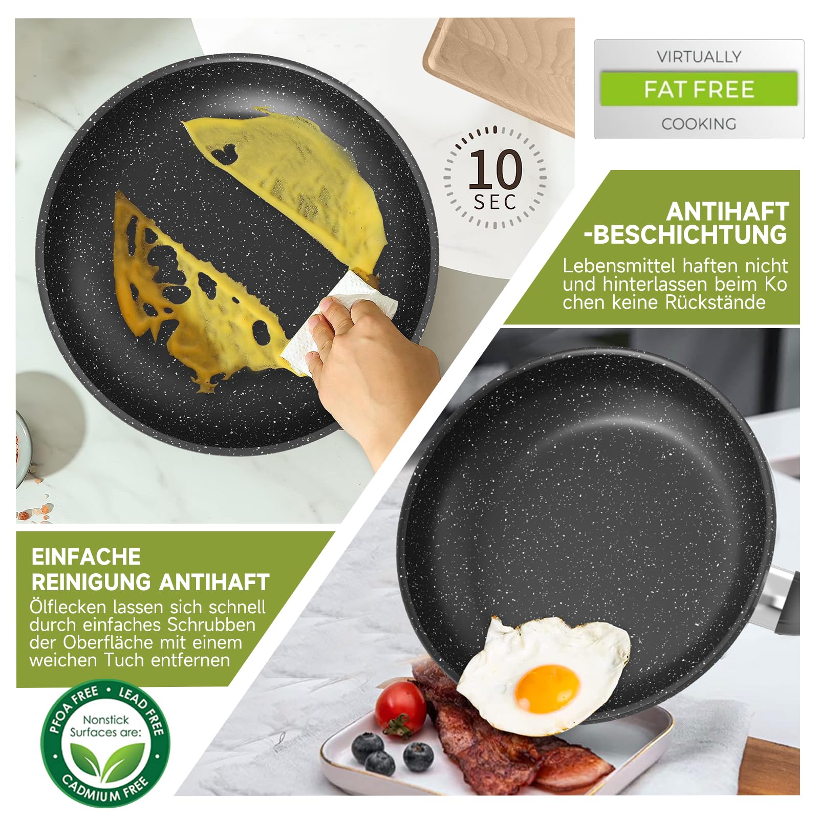 Jede Pfanne außer der Bratpfanne hat einen stabilen belüfteten Glasdeckel, und der hitzebeständige Deckel aus gehärtetem Glas erleichtert die Überwachung des Kochfortschritts. Das professionelle Pfannenset für den Haushalt verfügt über ergonomische und hitzebeständige Cool-Touch-Griffe für bequemes und sicheres Kochen, sodass Sie jede Pfanne sicher in der Küche bewegen können, ohne sich die Hände zu verbrennen.
