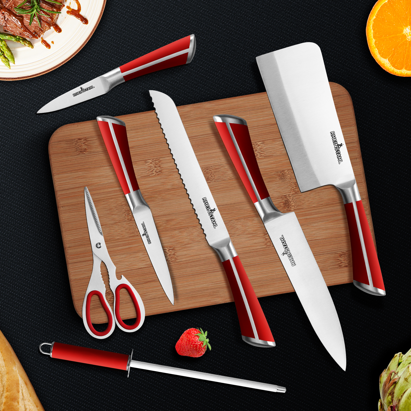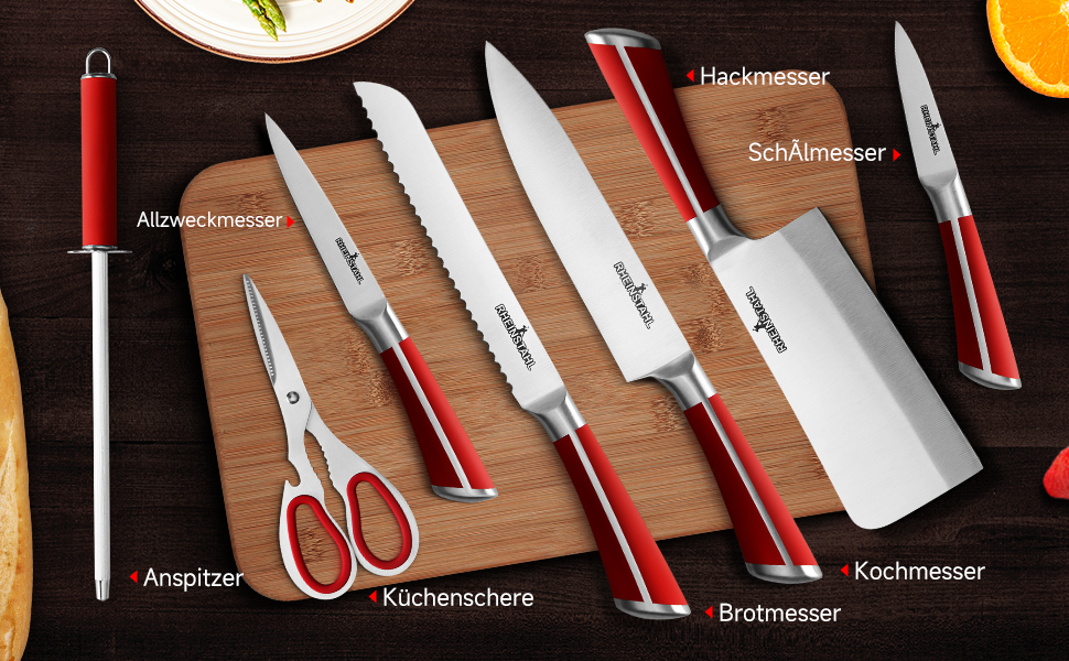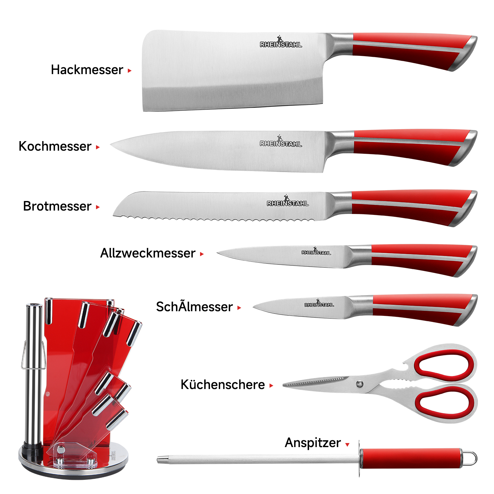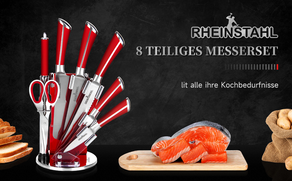 RHEINSTAHL Messerblock mit Messer, 9-tlg Messer Set mit Acrylblockhalter, Scharf Edelstahl Küchenmesser, Kochmesser Set mit Manuellem Anspitzer Schälschere,RH-8P2KSRS
