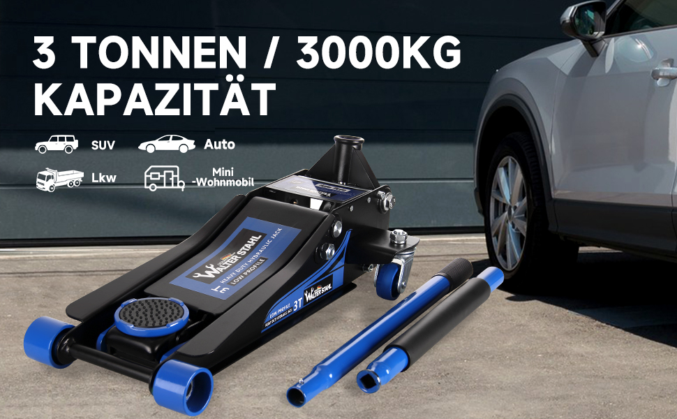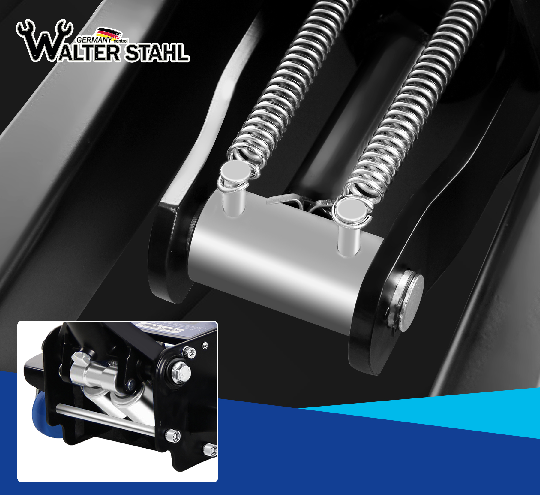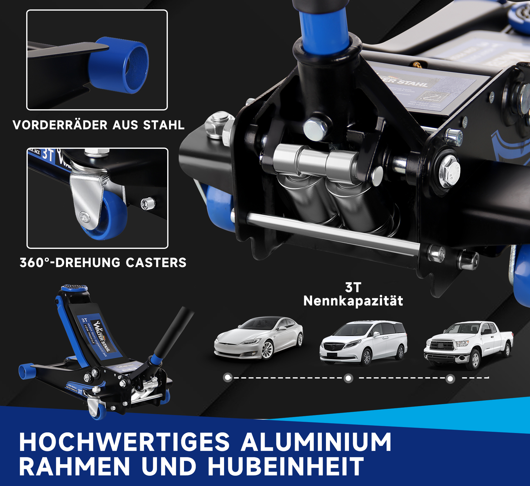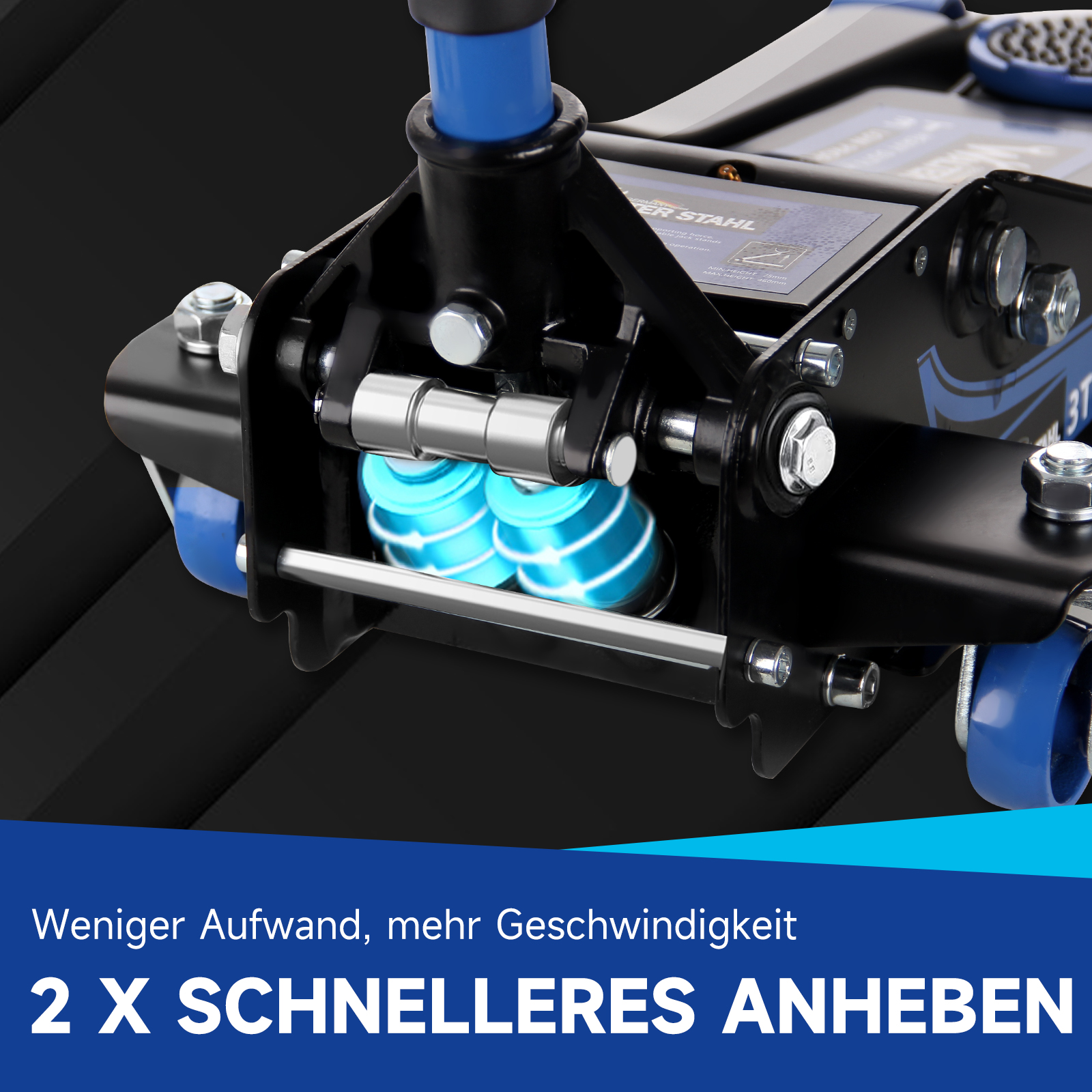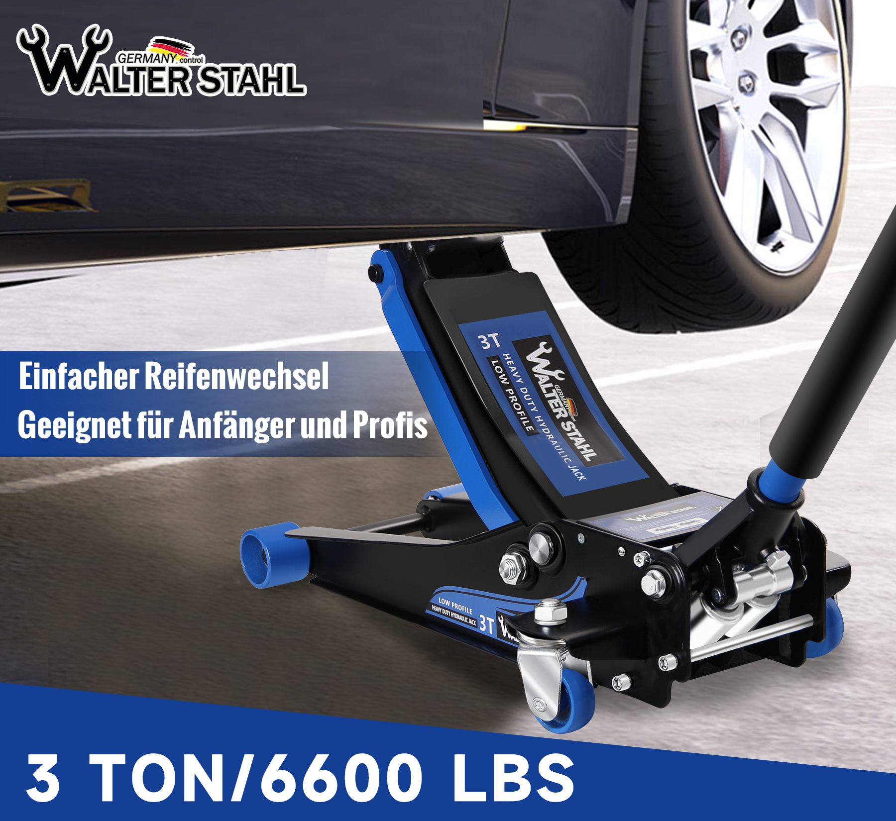 Dieser jack verfügt über eine 3 Tonnen (6600 lb) starke Ladekapazität. Ein duales, paralleles Pumpensystem ermöglicht es Ihnen, den Wagenheber in vollen 7 Hüben auf den höchsten Punkt zu heben. Sie können den Wagenheber leicht auf die gewünschte Höhe anheben. Ersetzen Sie einen Reifen, wechseln Sie das Öl oder warten Sie die Bremse.