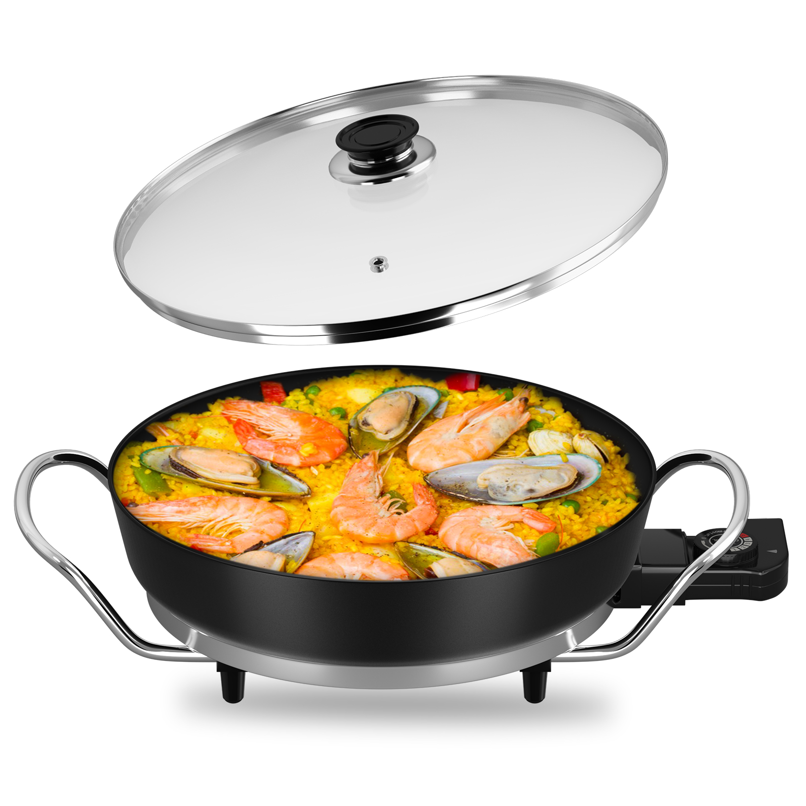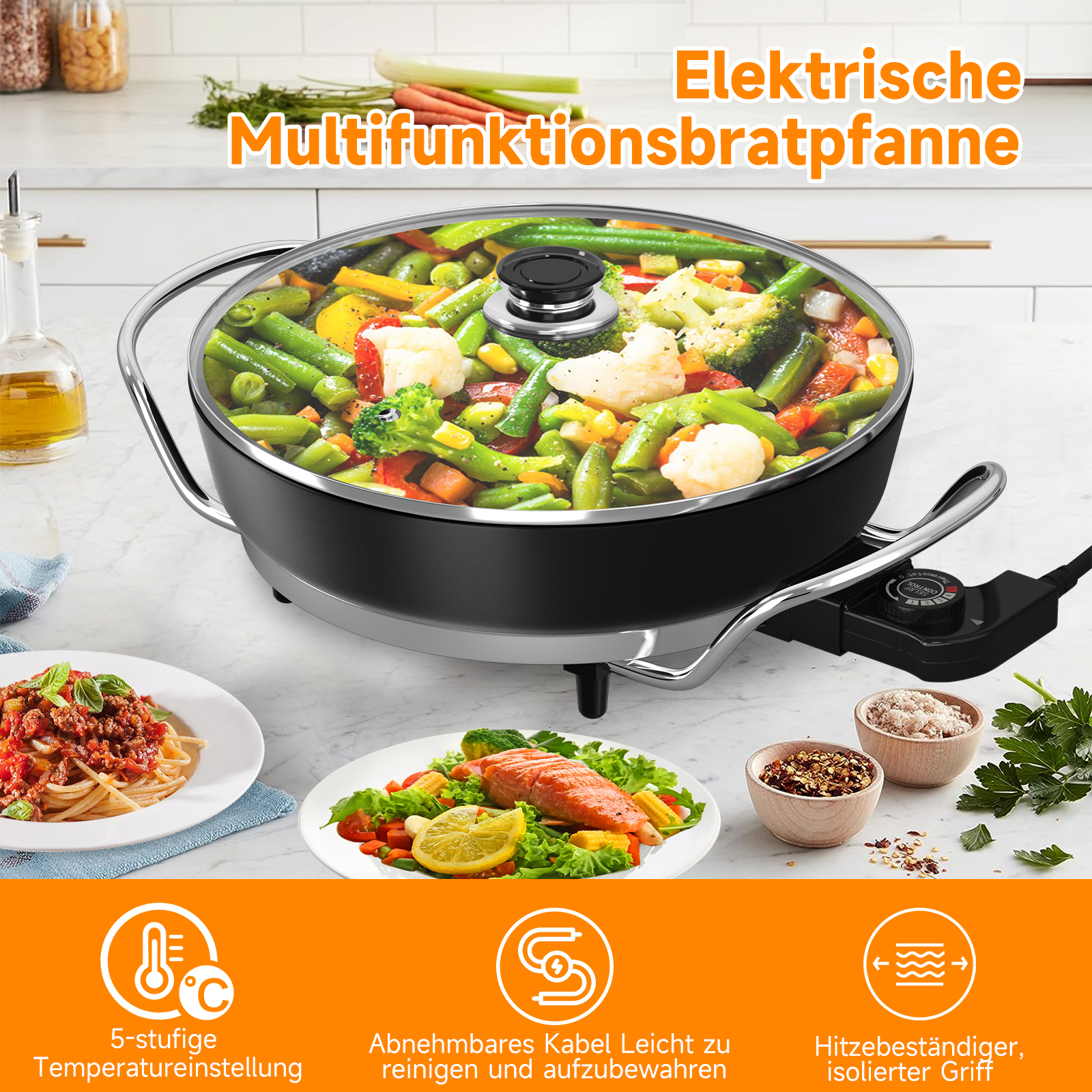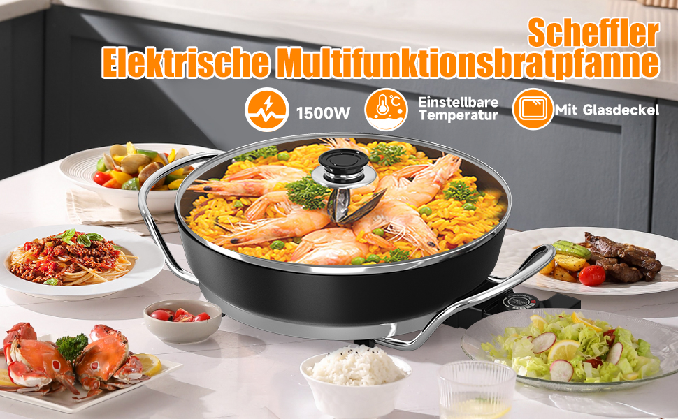 Mit unseren Elektropfannen können Sie zu Hause jederzeit Gourmetgerichte zubereiten. Pizza. Diese multifunktionale elektrische Pfanne kann eine Vielzahl von Lebensmitteln braten, grillen, schmoren und dämpfen und bietet Ihnen unendliche Kochmöglichkeiten. Ideal für Nudeln, Würstchen, Steaks, Bratkartoffeln, Gemüse, Rührei und mehr.