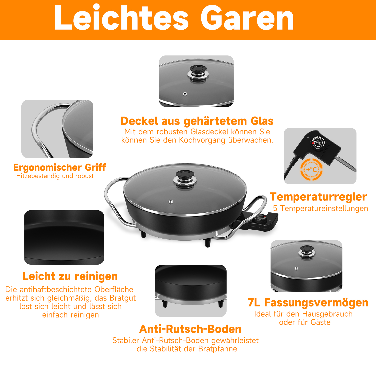 Mit dem einstellbaren Thermostat können Sie die gewünschte Temperatur je nach Art der zubereiteten Speisen einstellen. Mit insgesamt 5 einstellbaren Temperatureinstellungen perfekte Kochergebnisse ist diese elektrische Bratpfanne für Ihre Kochbedürfnisse bestens gerüstet.
