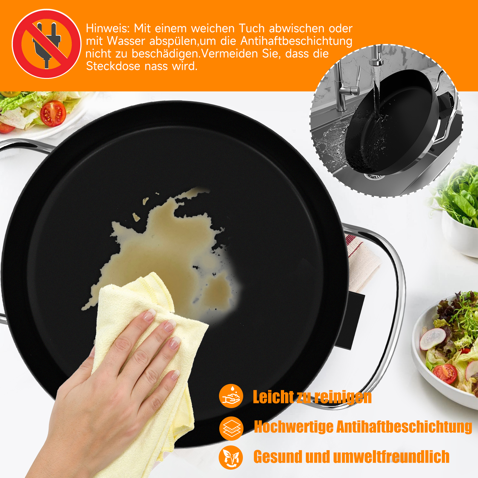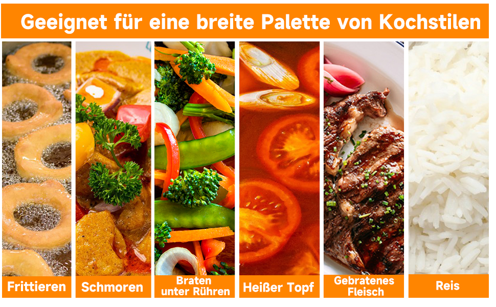 Dank der hochwertigen Antihaftbeschichtung wird nur wenig Fett zum Kochen benötigt und die Speisen bleiben nicht an der Pfanne haften, was Ihnen bei der Zubereitung gesunder und fettarmer Speisen helfen kann. Nach dem Gebrauch können Sie den Boden der Pfanne einfach mit einem weichen Tuch reinigen, ohne sie abzuspülen oder einzuweichen.