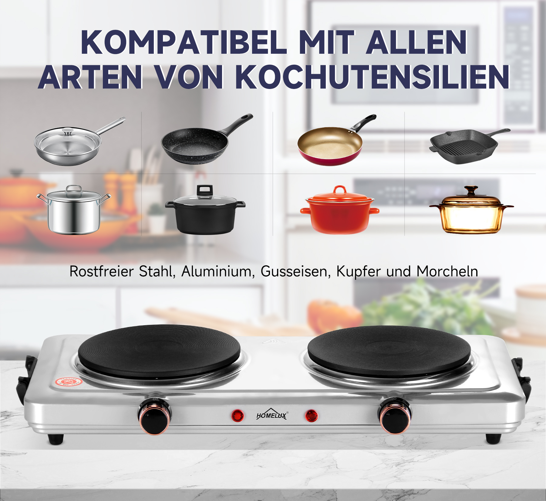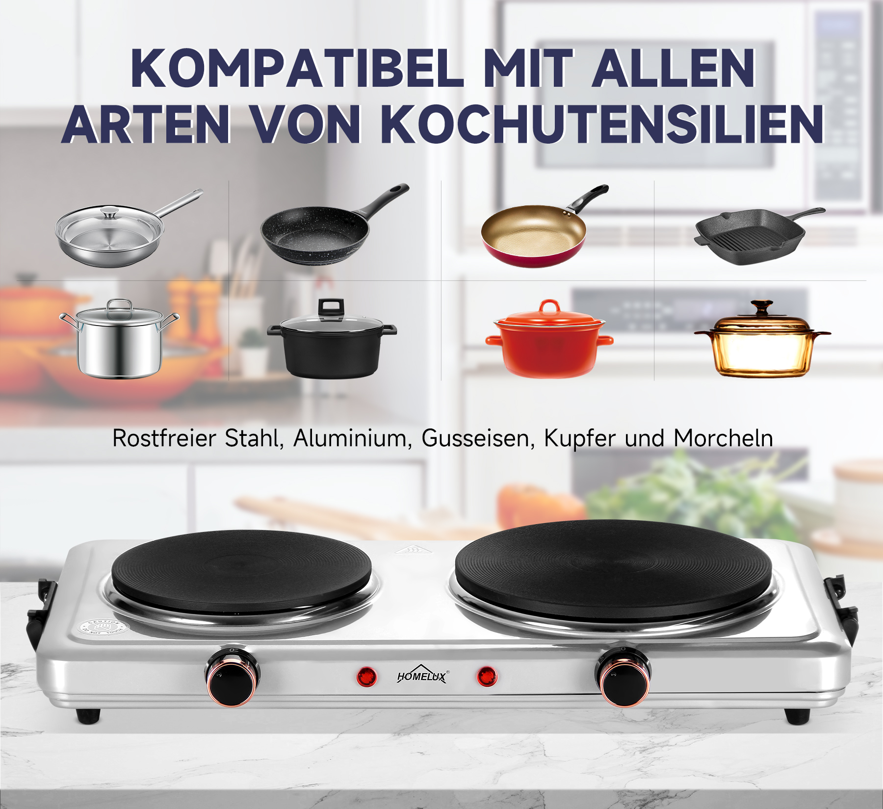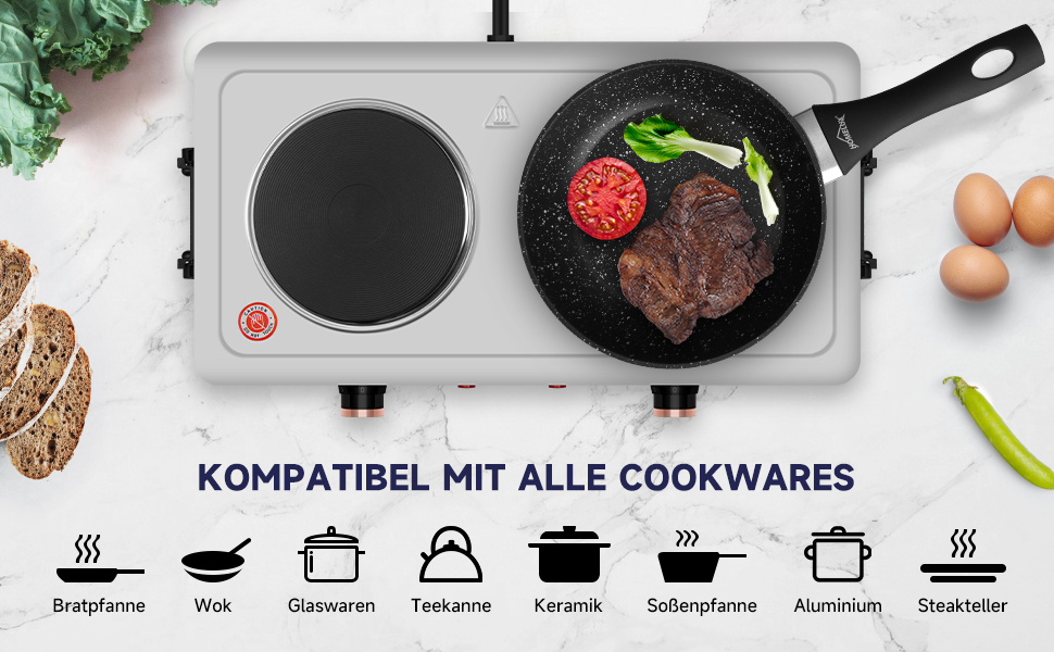 Der HOMELUX herdplatte kann mit jedem Kochgeschirr mit flachem Boden aus einer Vielzahl von Materialien verwendet werden. Beispiele sind Bratpfannen, Woks oder Herdkannen aus Aluminium, Edelstahl, Keramik oder Glas.