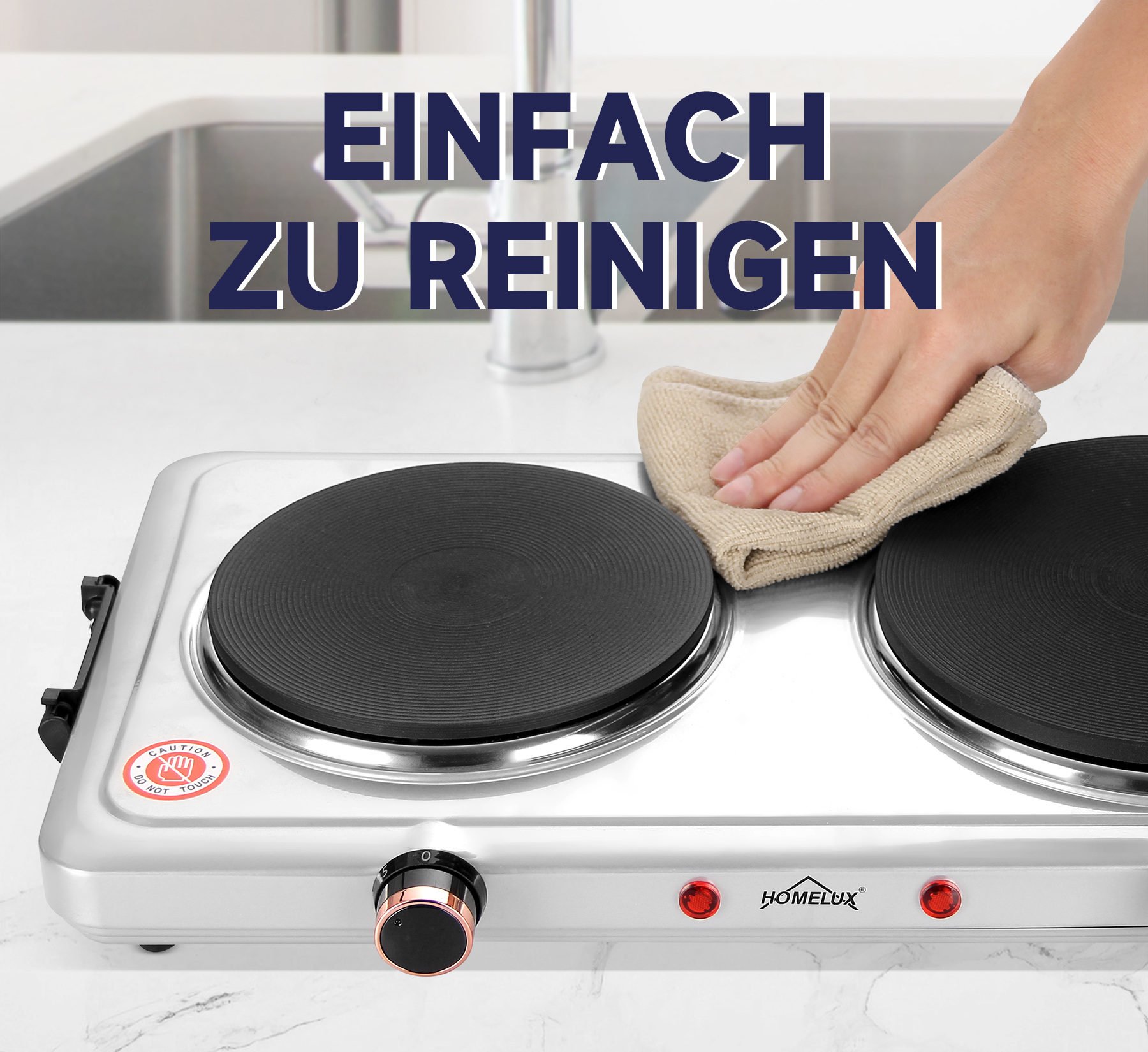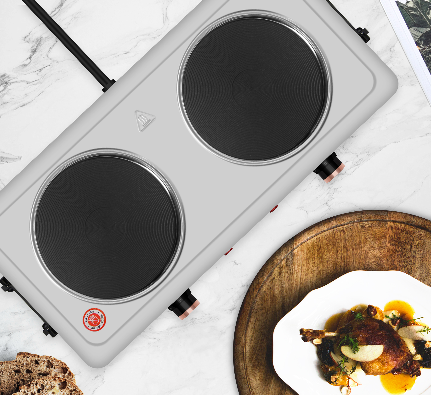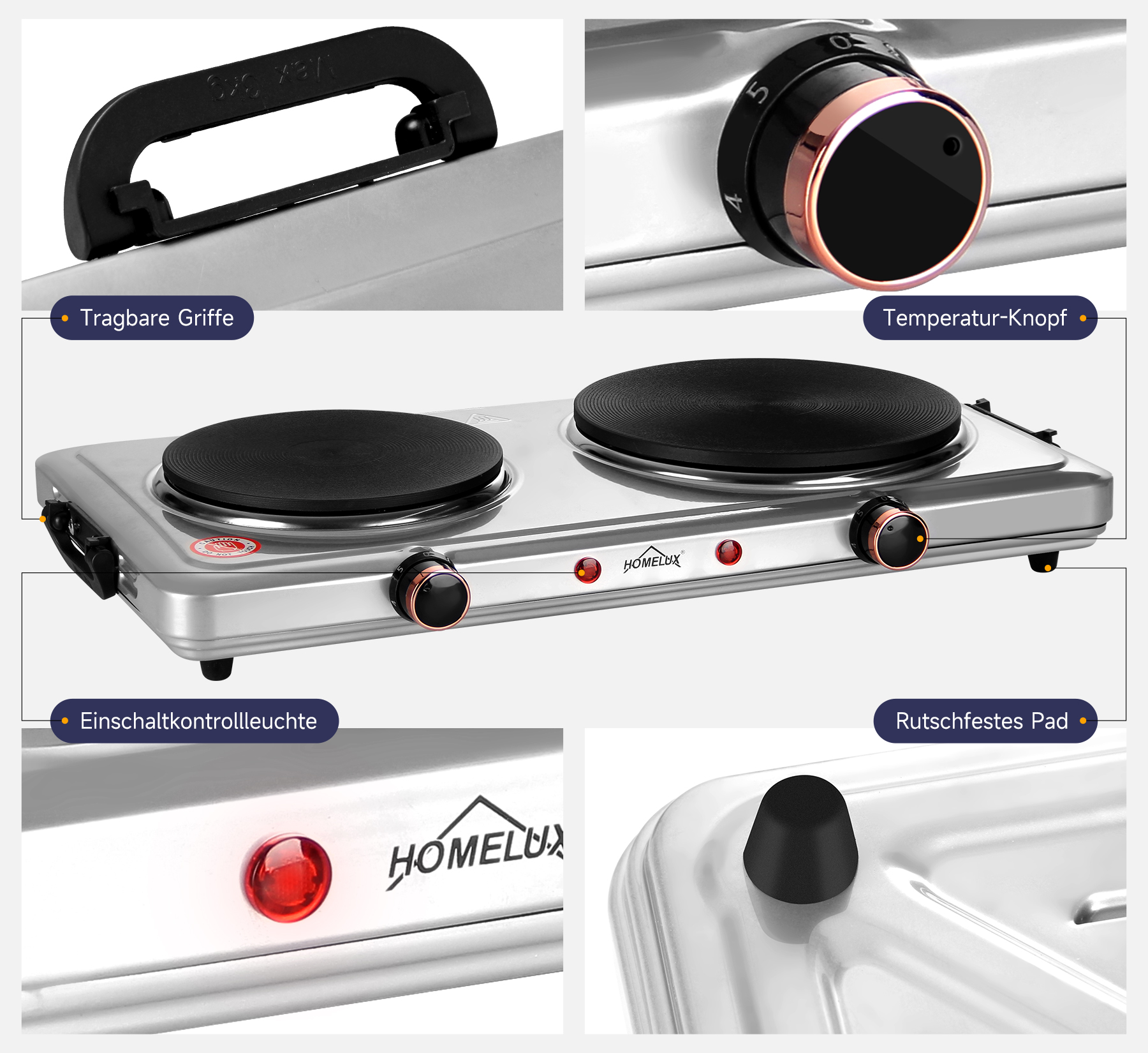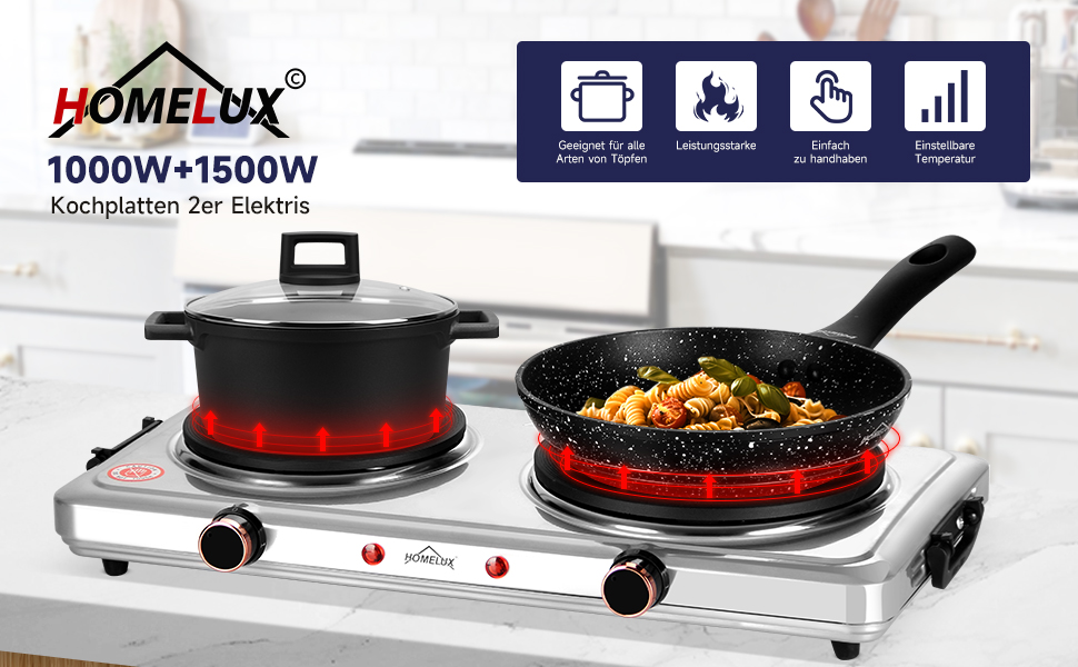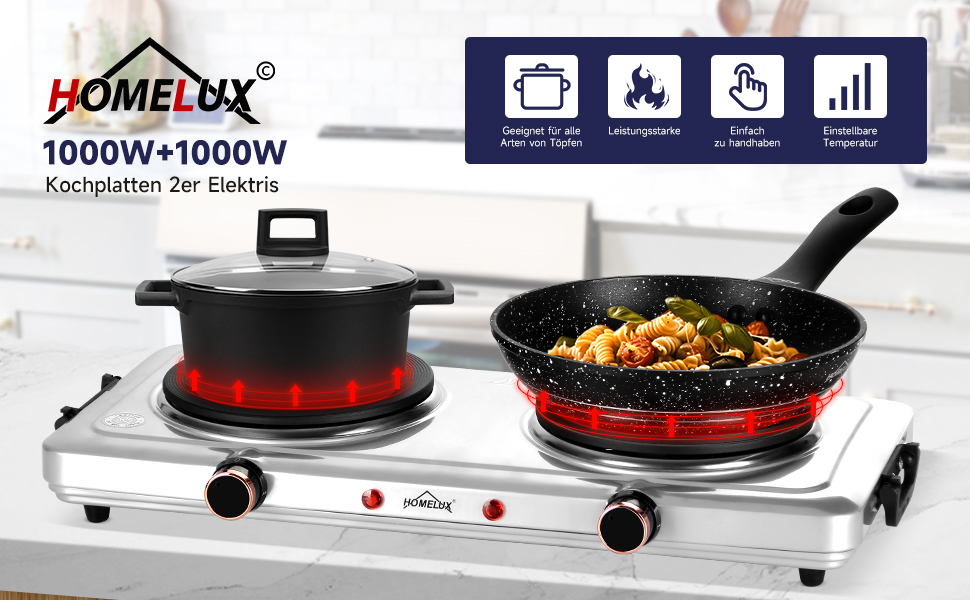 Mit einer kombinierten Wattzahl von 1000 W + 1000 W, zwei Kochplatten und individuellen Temperaturreglern können köstliche Mahlzeiten gleichzeitig zubereitet werden. Mit dem variablen Temperaturregler können Sie schnell die gewünschte Hitzeeinstellung LOW, MEDIUM oder HIGH erreichen und beibehalten, um Speisen warm zu halten oder heißes Wasser zu kochen.